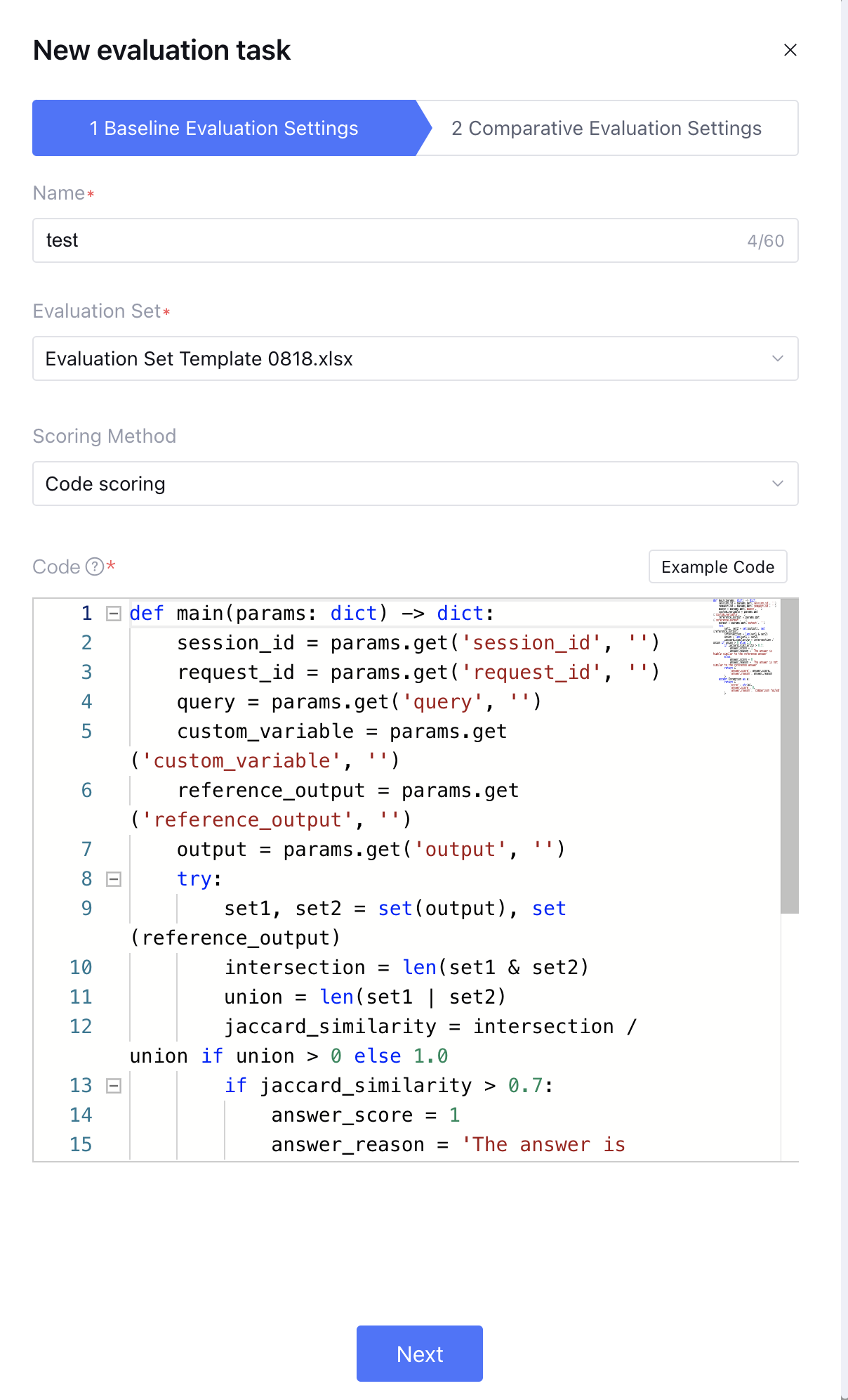 3. Code scoring: Uses custom code (Python supported) to score outputs. Can directly reference queries, preset columns, and custom columns.