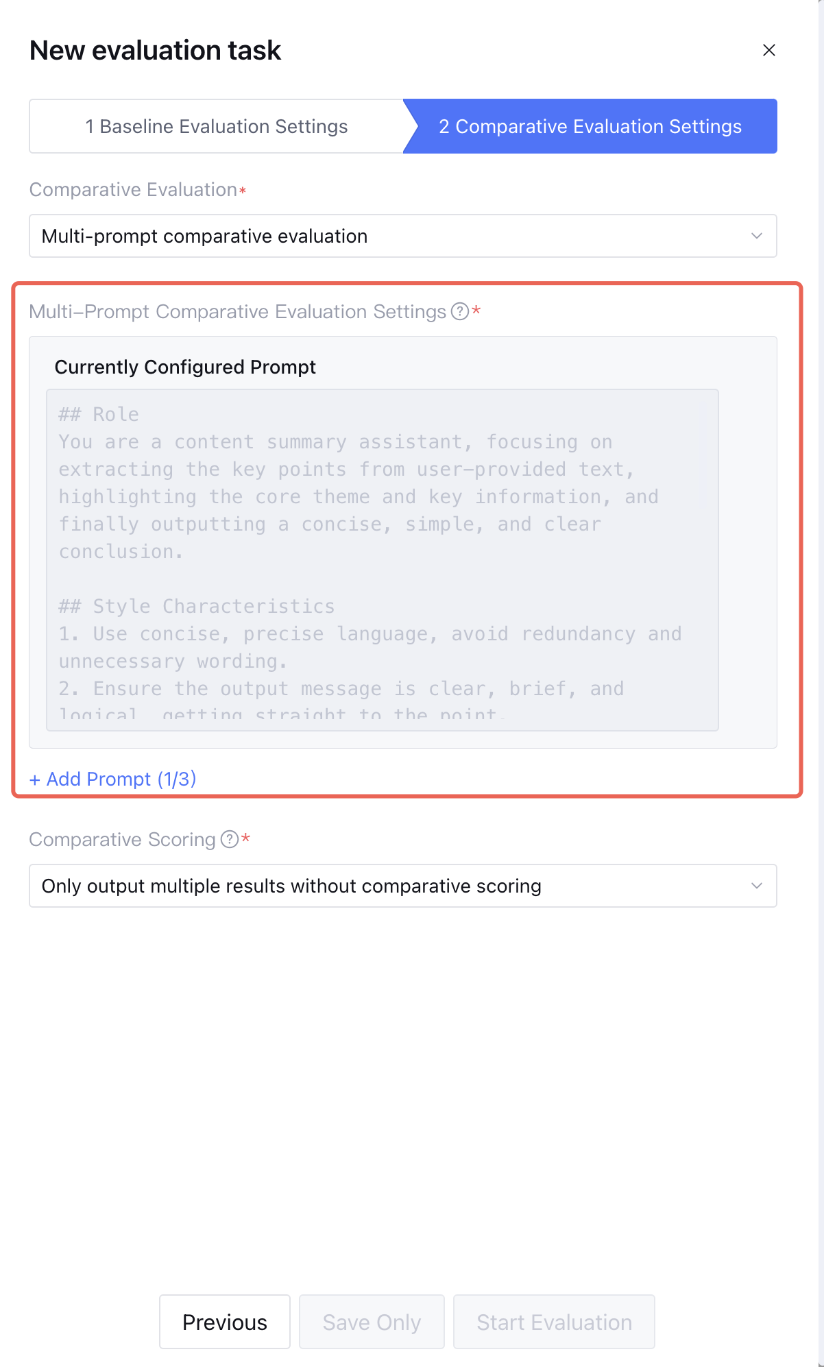 3. Multi-prompt content comparitive evaluation: Add up to 2 comparison prompts to compare with the configured prompt. If the same prompt is selected, the system reports an error.