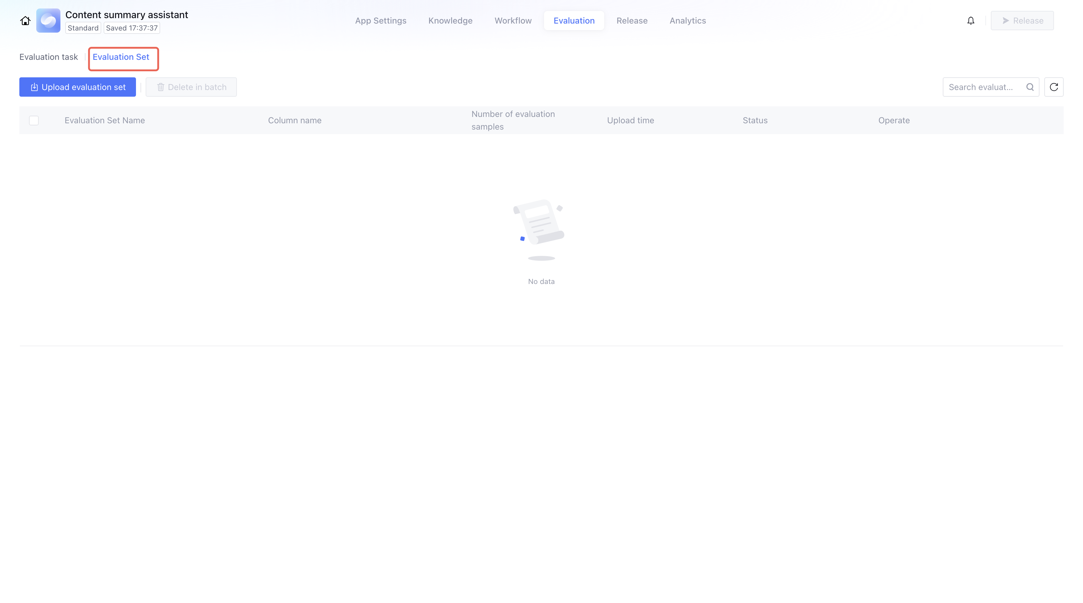 The evaluation set is a test dataset for batch testing application effects. It supports unified management and can be used repeatedly in follow-up tests.