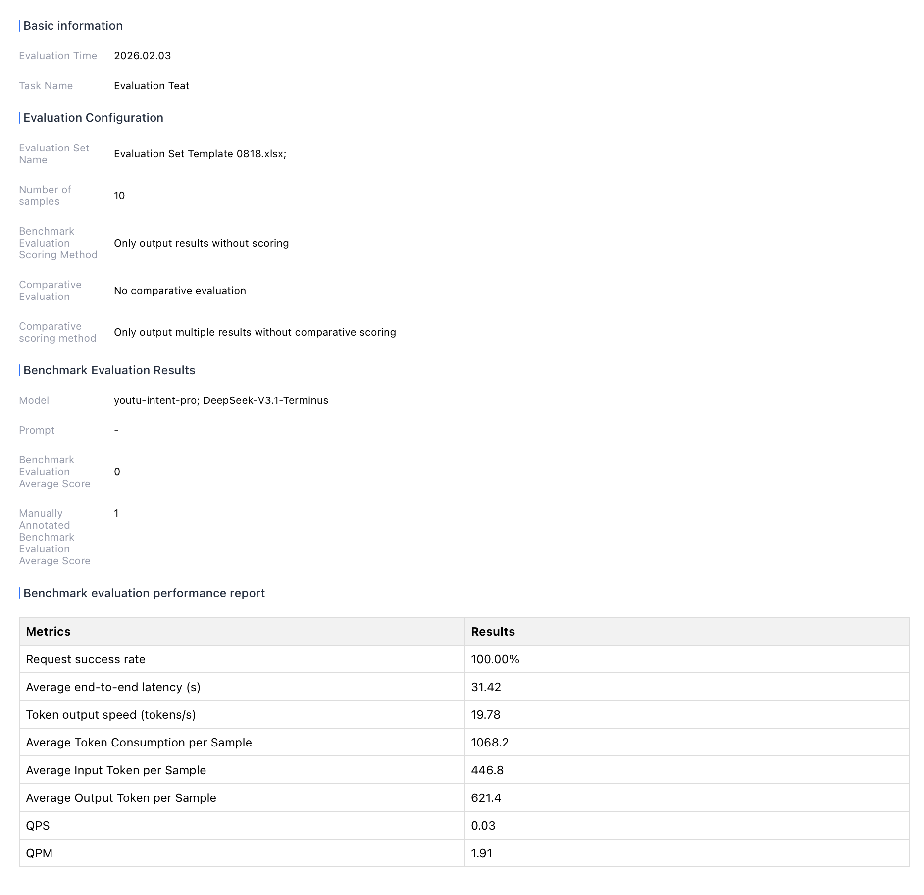View the report after batch processing or evaluation is completed. The report shows evaluation configuration message, benchmark evaluation result, comparison scoring result, benchmark performance report, etc.