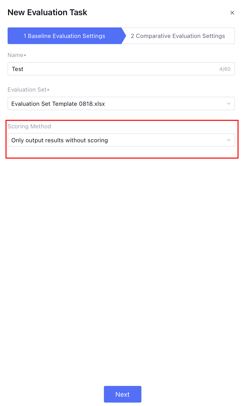 4. Output result only without scoring: Only perform batch execution of the evaluation set without any scoring, directly output the result. Selecting this method is equivalent to task execution batch processing.