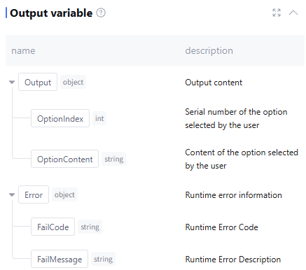 The output variable processed by this node by default includes the option number selected by users and the option content as two variables, as well as runtime error info Error (data type is object, this field is empty when running normally). Manual addition by users is not supported.