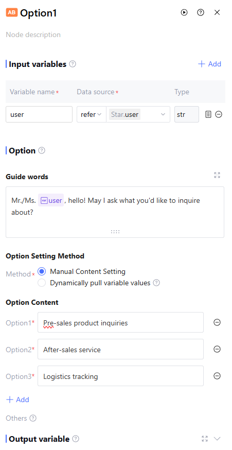 Manual Content Setting | Enter fixed options in the input box for option content. The input box supports referring to the input variable of that node by entering "/". Up to 20 options can be added. |