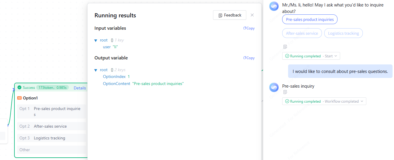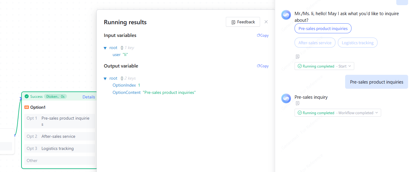 Dynamically pull variable values | Support using array<string> type variables as options, displaying the corresponding number of options at runtime based on variable values. Support selecting array<string> type output variables from all preceding nodes. |
