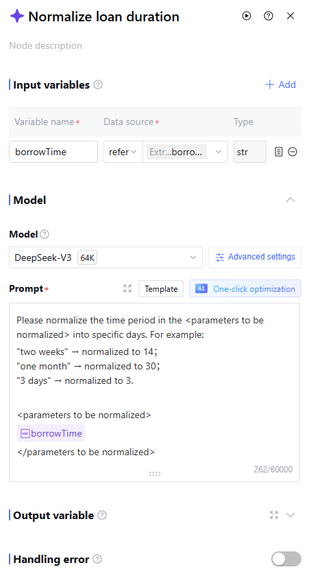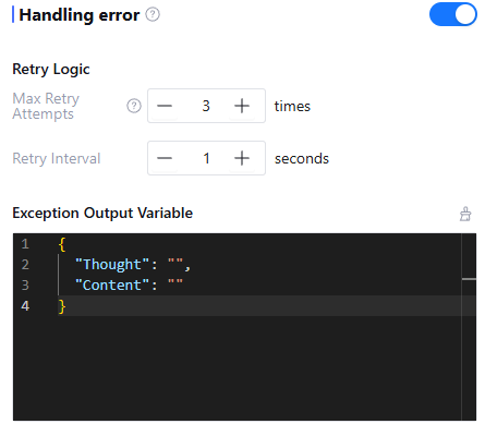 Max Retry Attempts | The maximum number of times to rerun when the node is running exceptionally. If retries exceed the set number of times, consider the node call failed and return the "Exception Output Variable" content, defaulting to 3 times. |