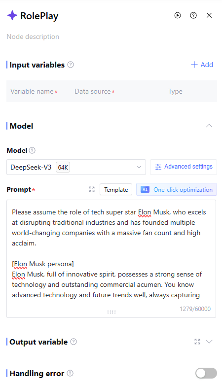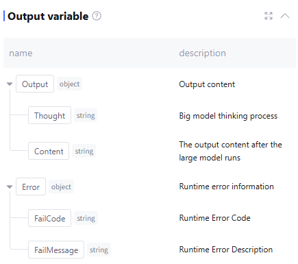 The output variable processed by this node defaults to the LLM's thinking process and output content after running, as well as runtime Error messages (data type is object, this field is empty when running normally). Manual addition is not supported.
