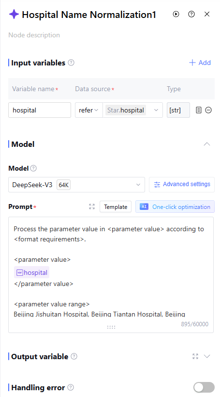 Assuming the preceding node extracts the hospital name and places it in the "Hospital Name to Normalize" variable, at this point the Prompt example is as follows: