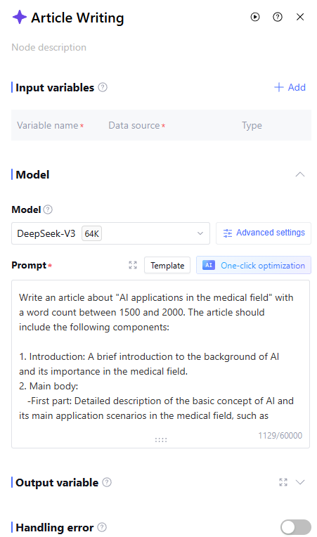 The "Thought" field in the output variable contains the thinking process of deep thinking models (such as DeepSeek R1). For models without deep thinking capacity (such as DeepSeek V3), this field is empty.