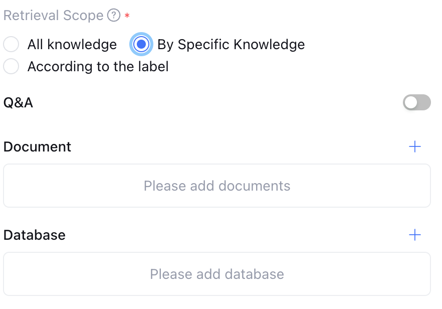 By Specific Knowledge | Specific knowledge is divided into document, Q&A, and database. For documents, support manual selection of documents for knowledge retrieval. For Q&As, support enabling or disabling Q&As. If enabled, it will recall all Q&As. For databases, support manual selection of databases for knowledge retrieval. |