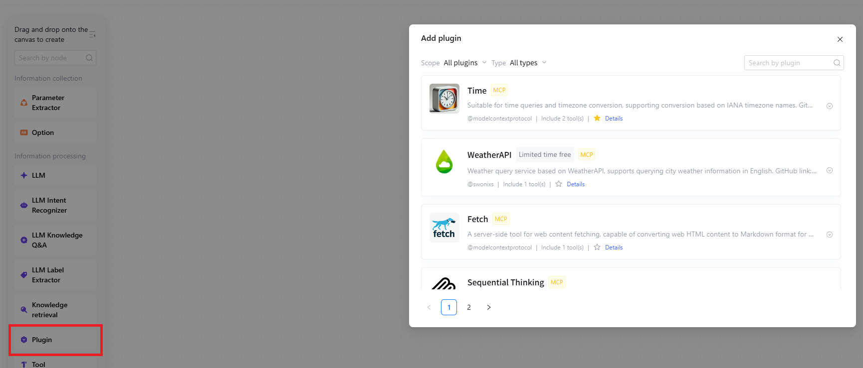 Plugin Node belongs to Information Processing Node, supporting users to refer to officially provided plug-ins or self-registered plug-ins (for registration method, please refer to related documentation in the plugin center).