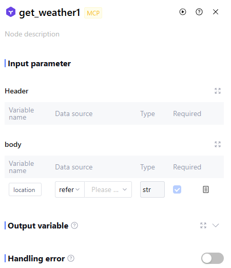 Data source | The data source of this variable supports two options: "refer" and "input". "Refer" allows selecting output variables from all preceding nodes, while "input" supports manually filling in a fixed value. |