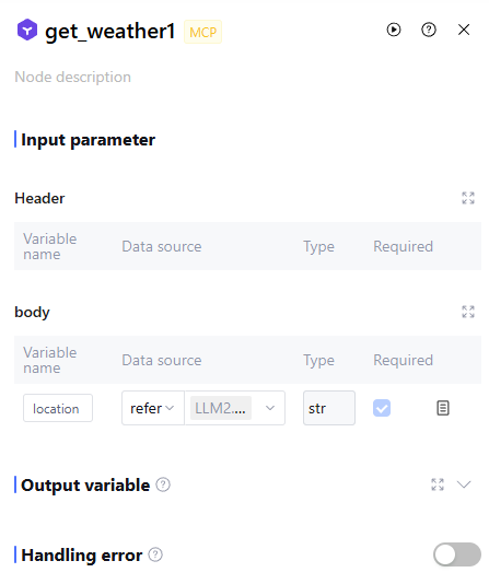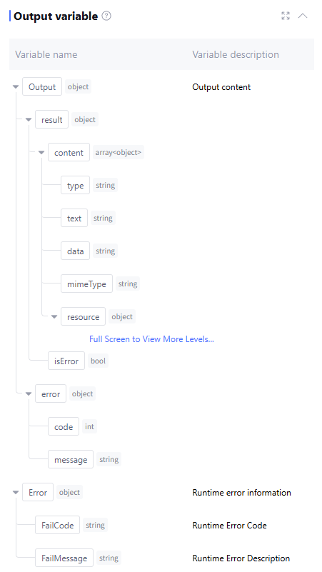 The output variable processed by this node includes the result of calling the tool as well as runtime Error info (data type: object, this field is empty during normal operation). Manual addition is not supported.