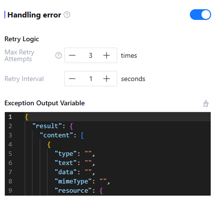 Exception handling can be enabled manually, supporting exception retry and output content configuration for anomalies. The configuration content is as follows.