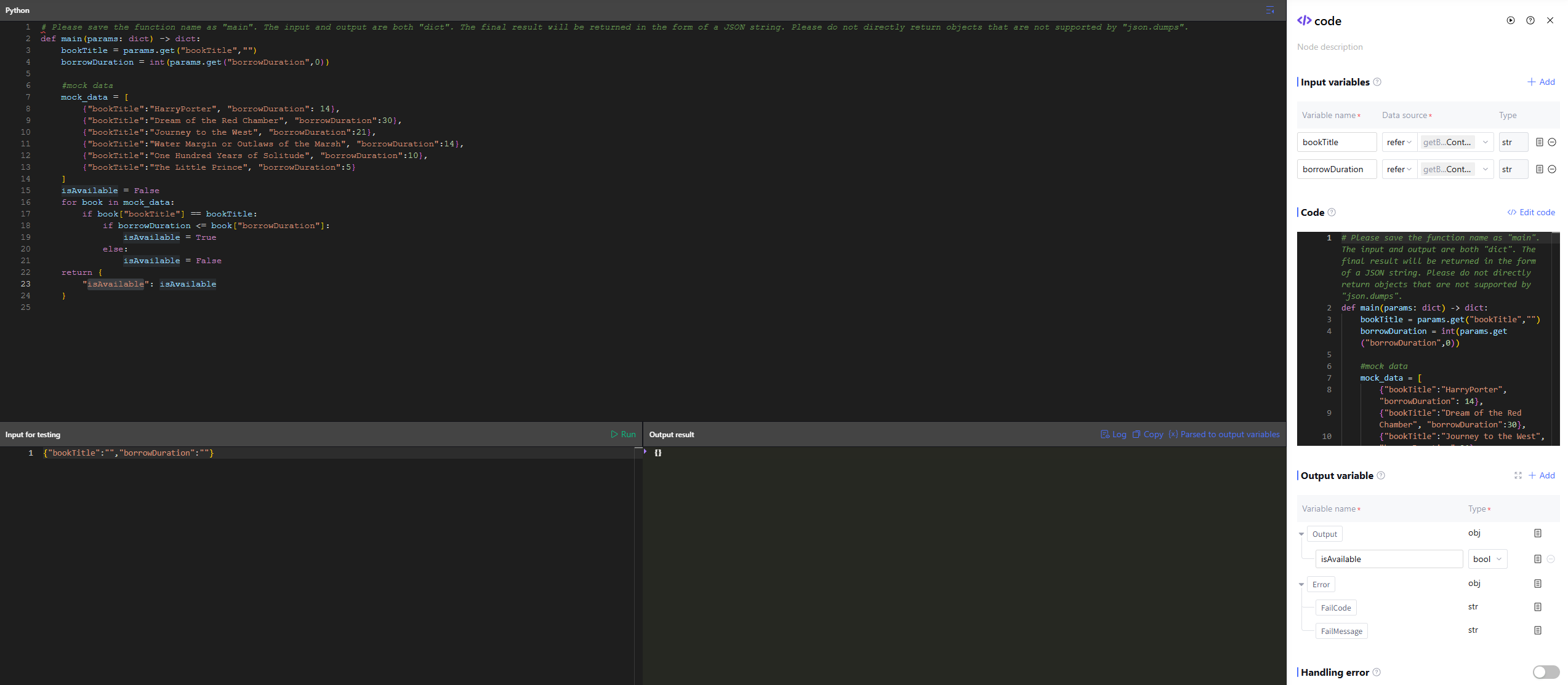 After editing the code, you can debug by filling in the input variable of the node in the "Input for testing" box. Click the "Run" button to execute the code, and view the corresponding result in the "Output Result" box.