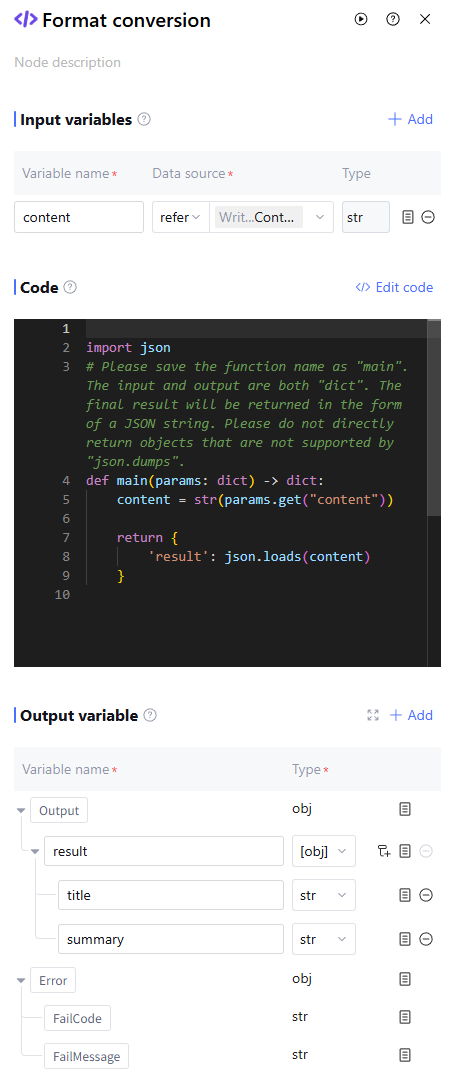 The output variable processed by this node is empty by default. Users can manually add output variables or use the "Parsed to output variables" feature to automatically fill them from the code execution results. It also contains runtime error information Error (data type is object, this field is empty during normal operation).