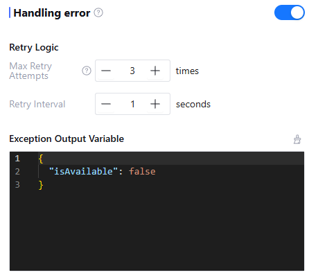 Max Retry Attempts | The maximum number of times to rerun when the node is running exceptionally. If retries exceed the set number of times, consider the node call failed and return the "output variable for anomalies" content, defaulting to 3. |