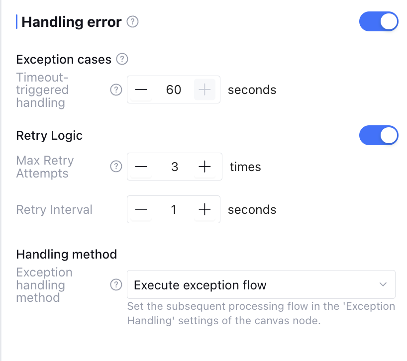 Exception handling can be enabled manually (off by default), supporting exception retry and exception handling method configuration. The configuration content is as follows: