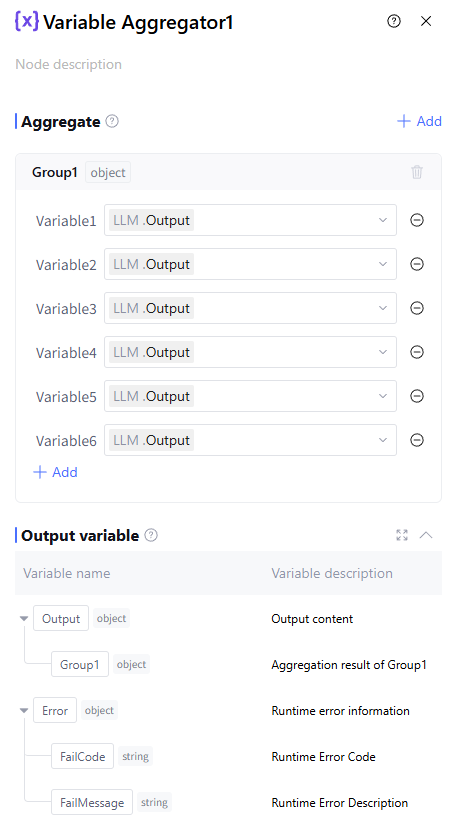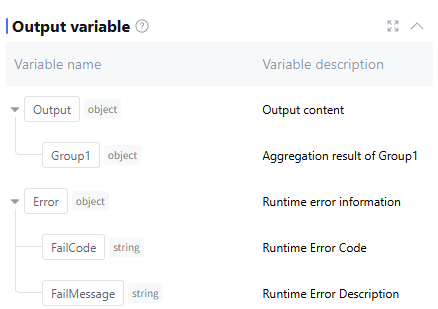 The output variable processed by this node. By default, it is the user-configured Group, outputting the aggregated result of each Group as well as runtime error info Error (data type is object, this field is empty during normal operation). Manually add is unsupported.