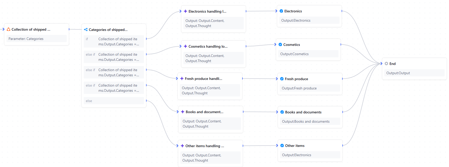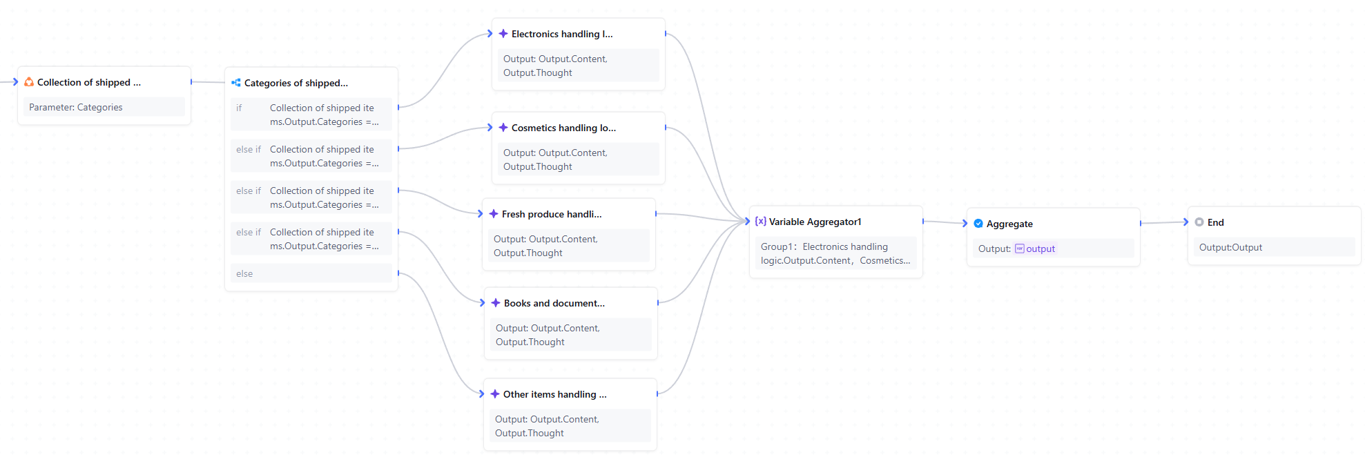 In the express delivery fee inquiry scenario, based on the different items sent, the corresponding workflow branch will be executed with specific logic. For each type of item processed, it needs to connect to the reply node to output the processing result. Using the variable aggregate node can summarize the processing results of each branch, only requiring the output of the aggregated result.
