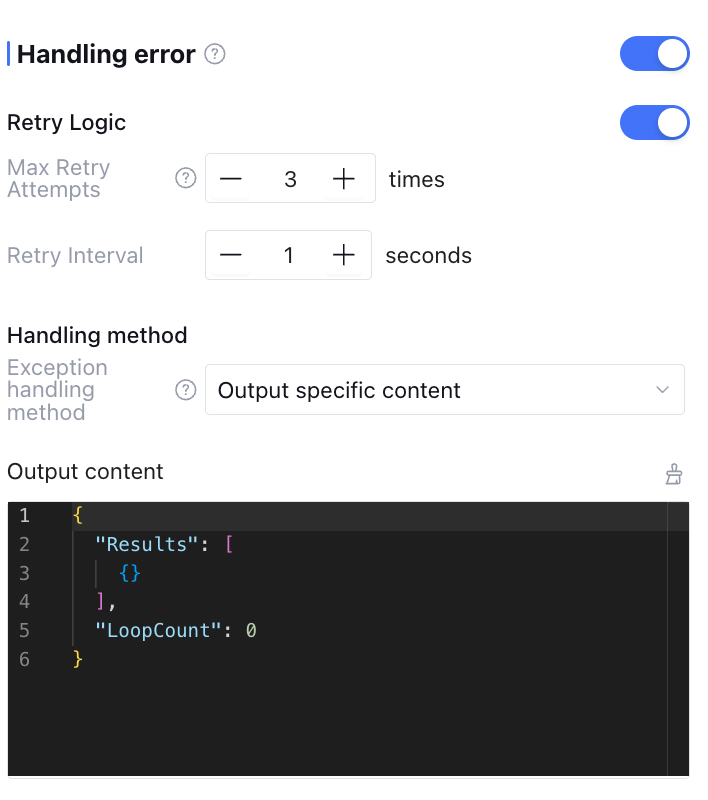 Output Variable | Select the exception handling method as "Output specific content". The output variable returned when retries exceed the maximum number. |