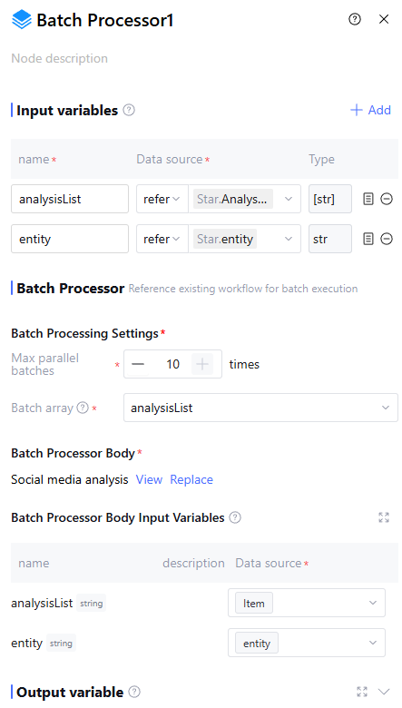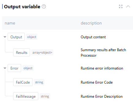 The output variable processed by this node includes the aggregated Results after batch processing (data type: array<object>) as well as runtime Error info (data type: object, this field is empty during normal operation). Manual addition is not supported.