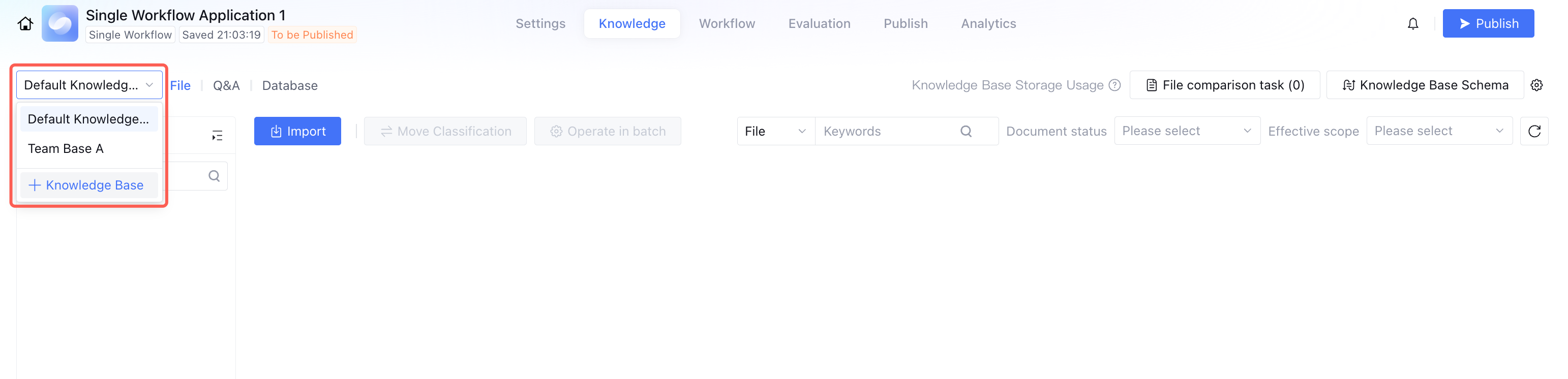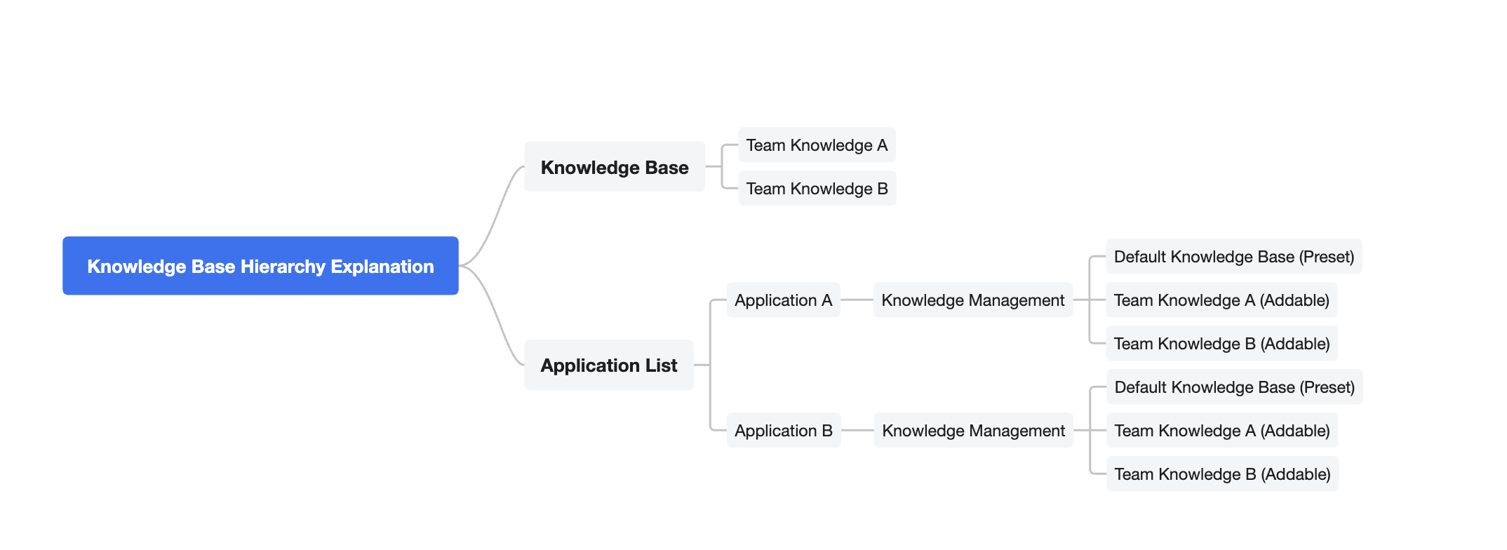 All team members can upload and maintain knowledge in the knowledge base within the platform. In specific applications, each application has a built-in knowledge management feature module with a default knowledge base, only for use within the current application, no support for sharing across applications. If necessary to reuse other knowledge content, you can add a platform-level knowledge base in the application's knowledge management. This ensures application independence while supporting knowledge sharing and reuse across applications. Creating a Knowledge Base
