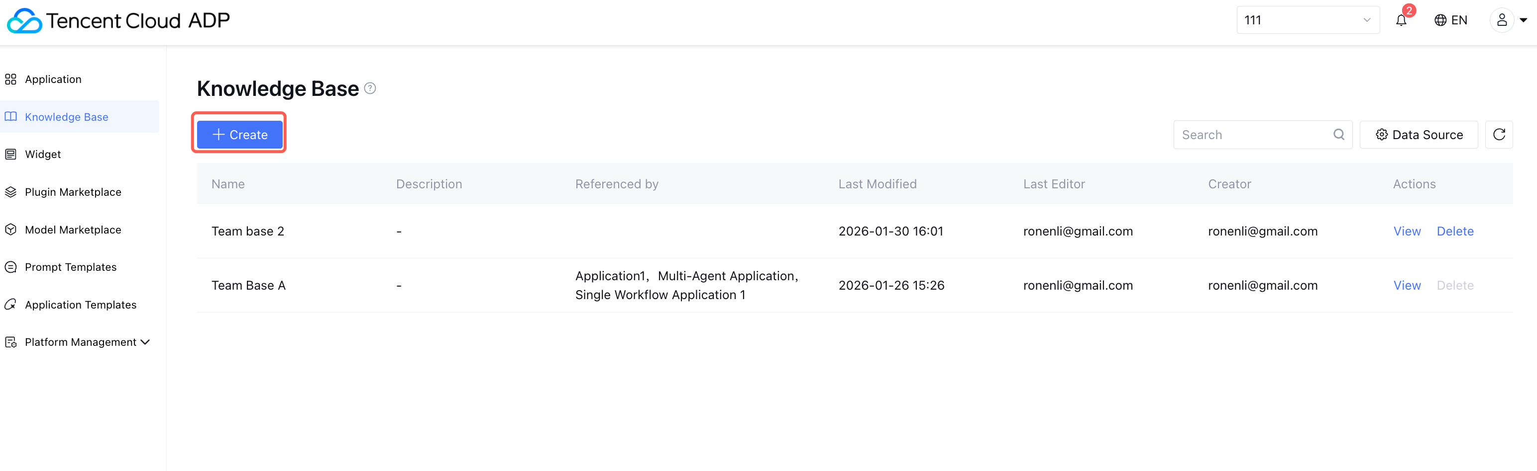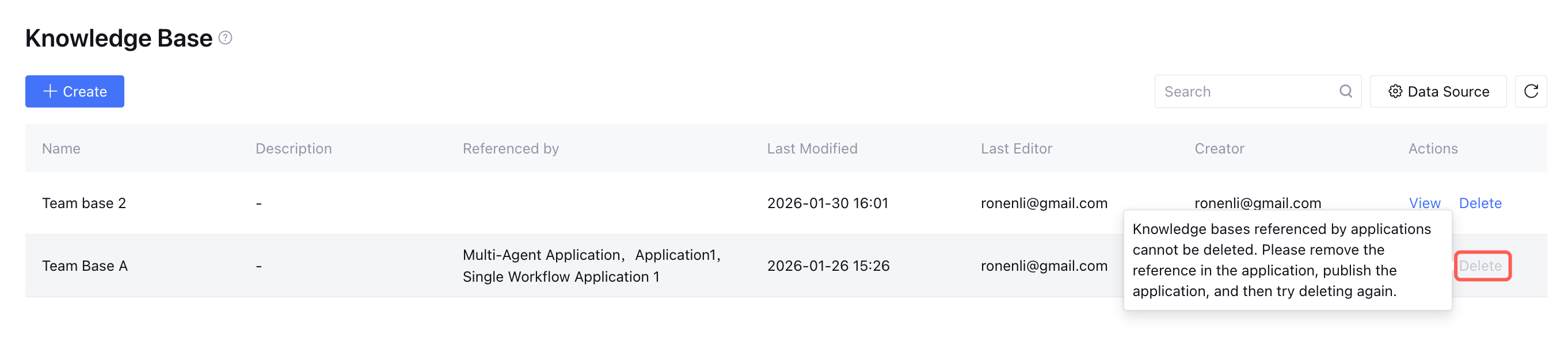 To delete a knowledge base, ensure it is not currently referenced by any application. If it is, remove the reference relationship first before deleting.
