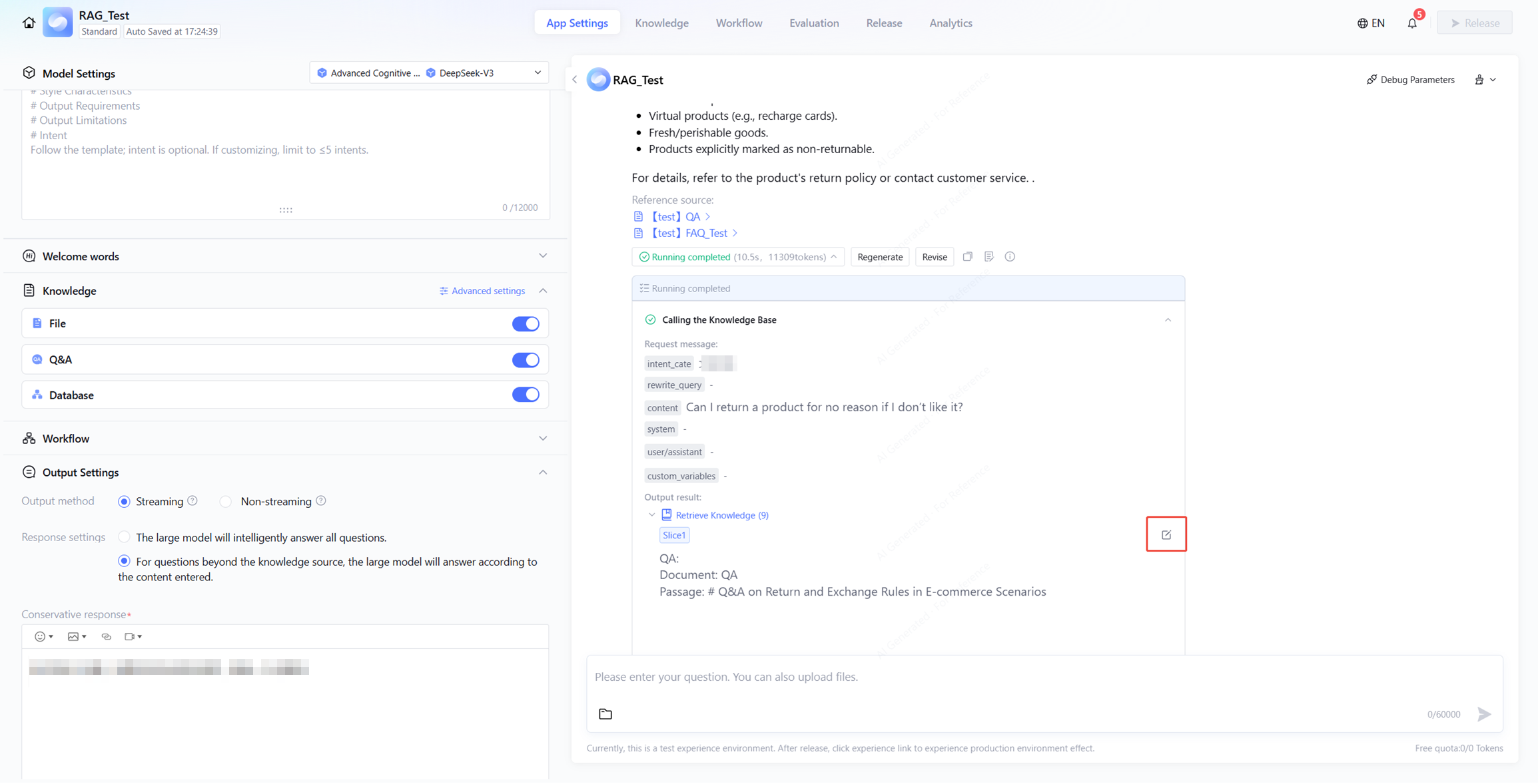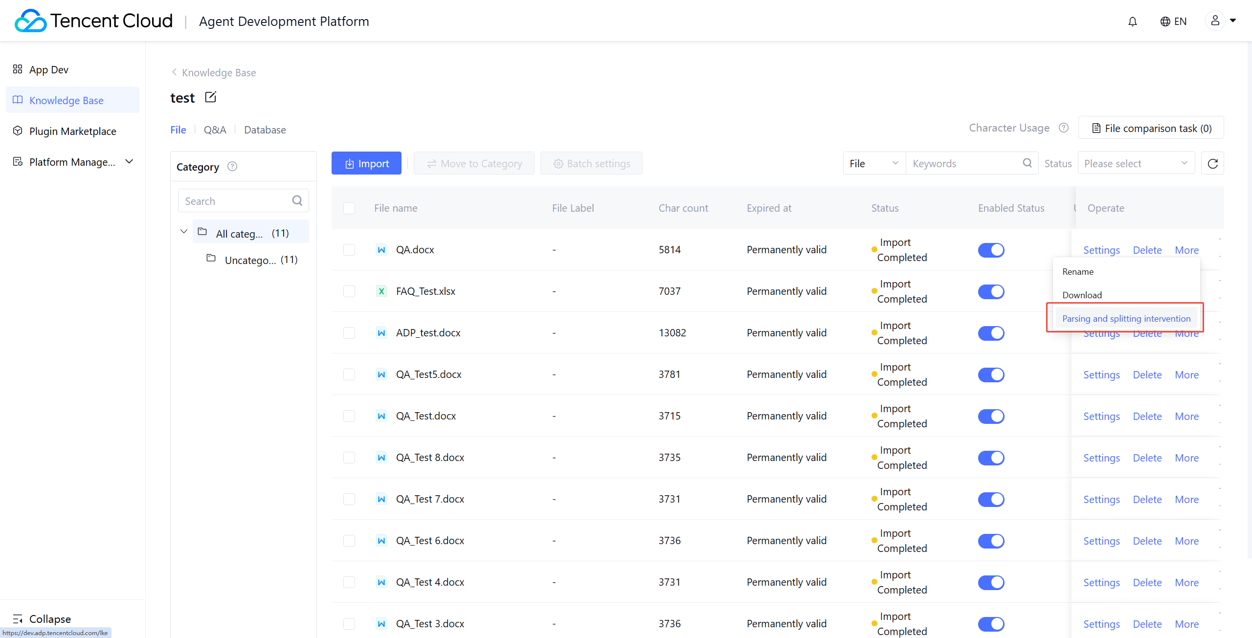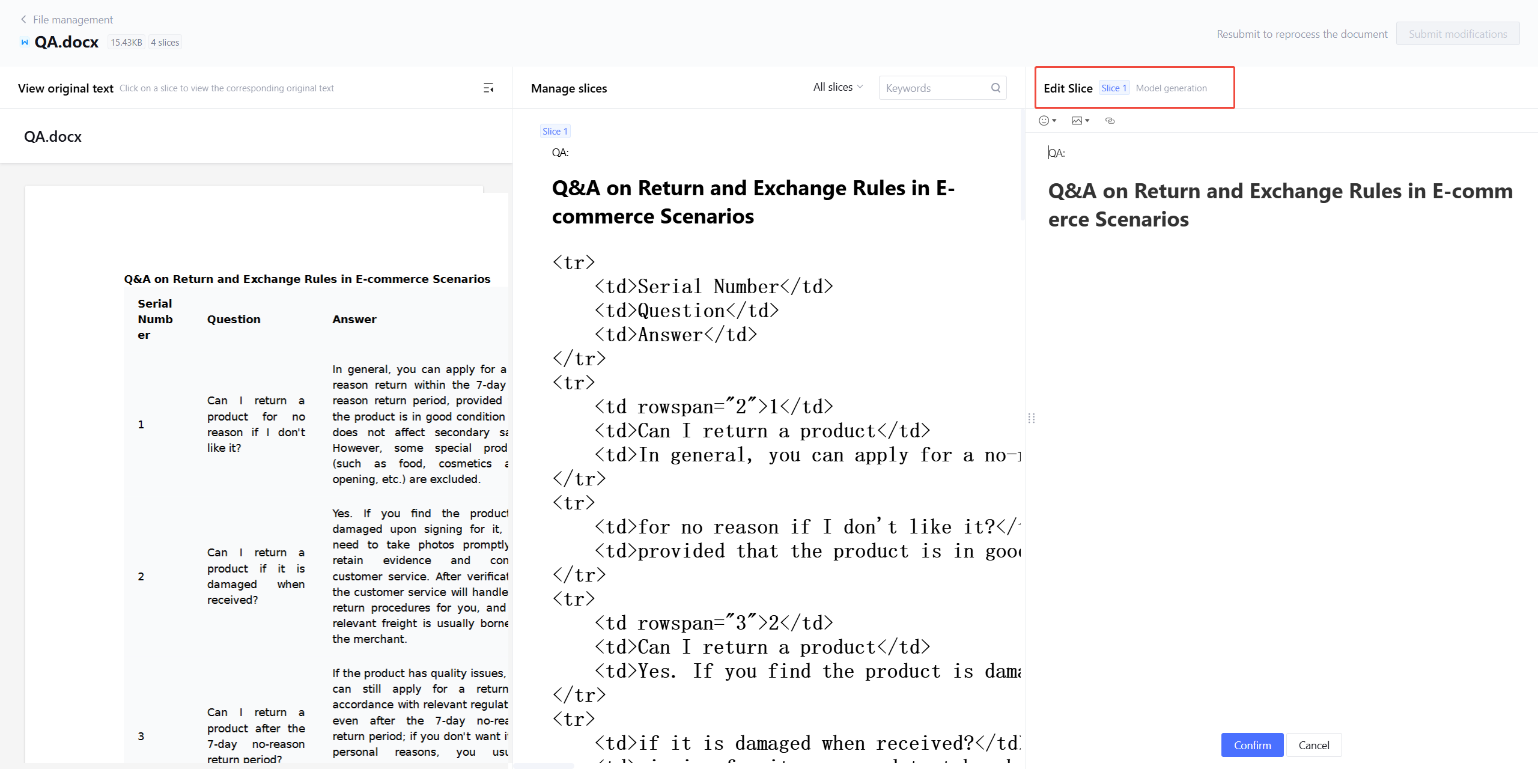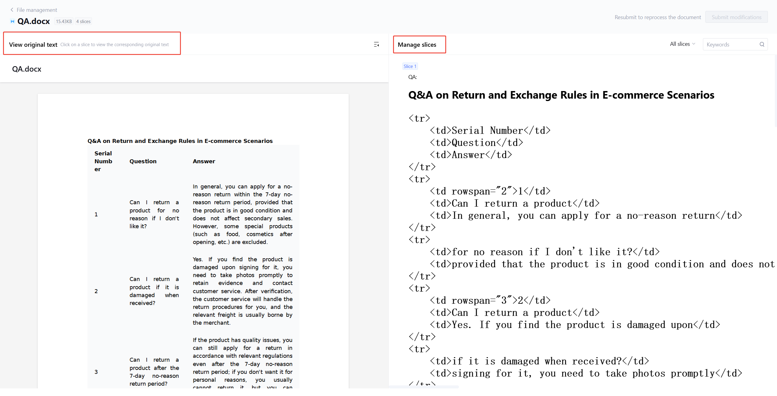 After uploading documents through the default knowledge base and shared knowledge base in the application, the system will store the documents as segmented slices after parsing and splitting. The parsing and splitting intervention feature supports manual intervention on the parsed and split slices.