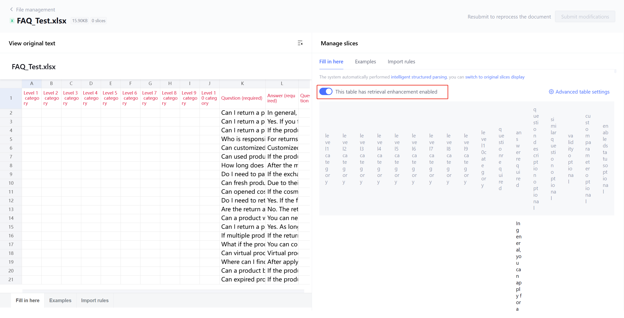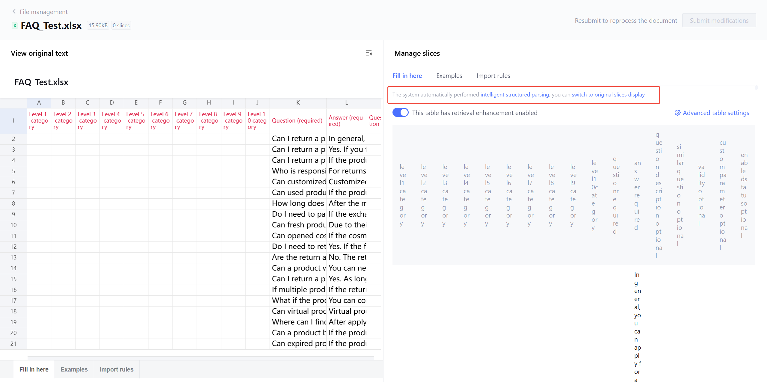 After the user uploads documents, the system automatically determines whether the imported table file is in a structured format by calling the structured table rewrite model. No need to perform any additional configuration.