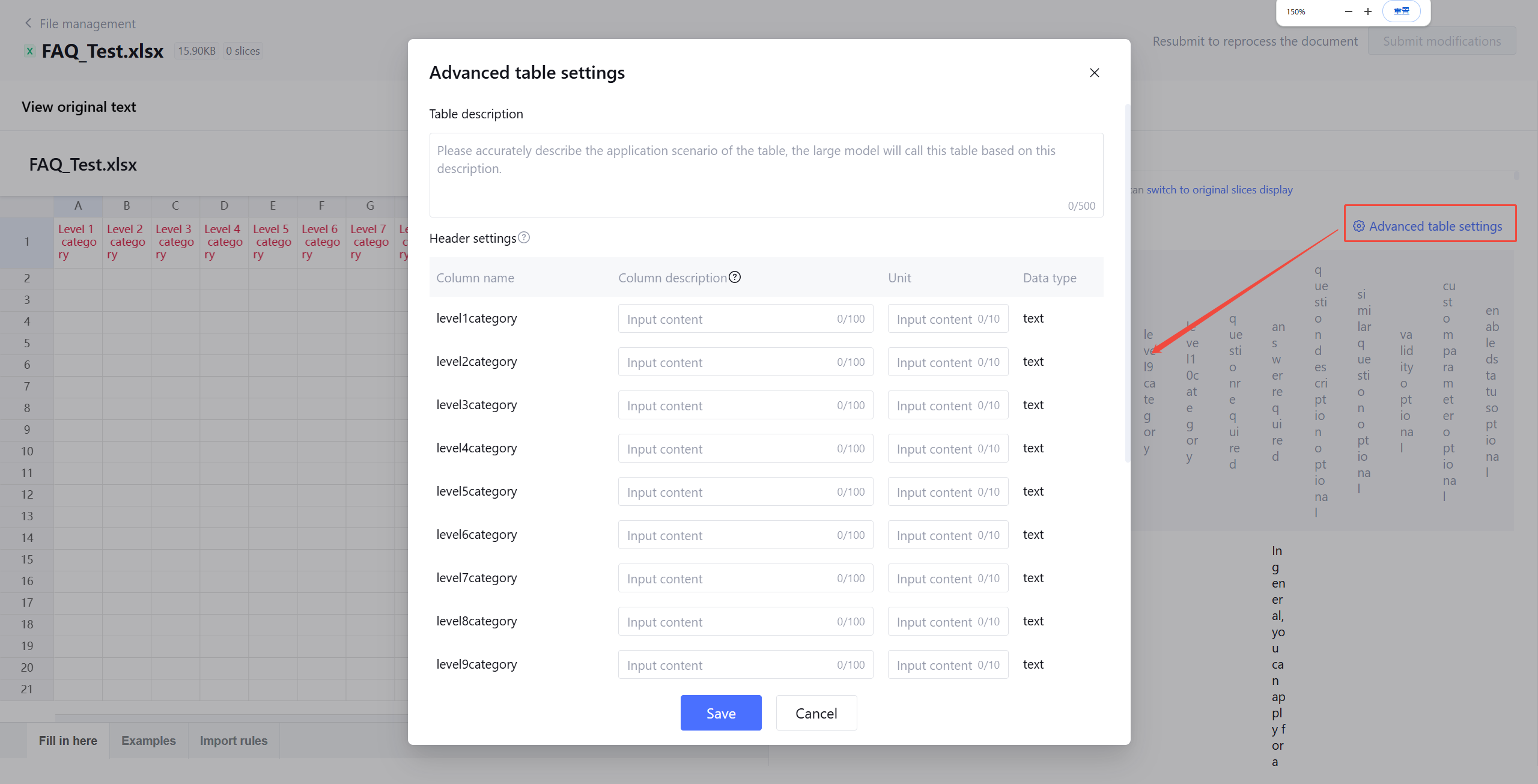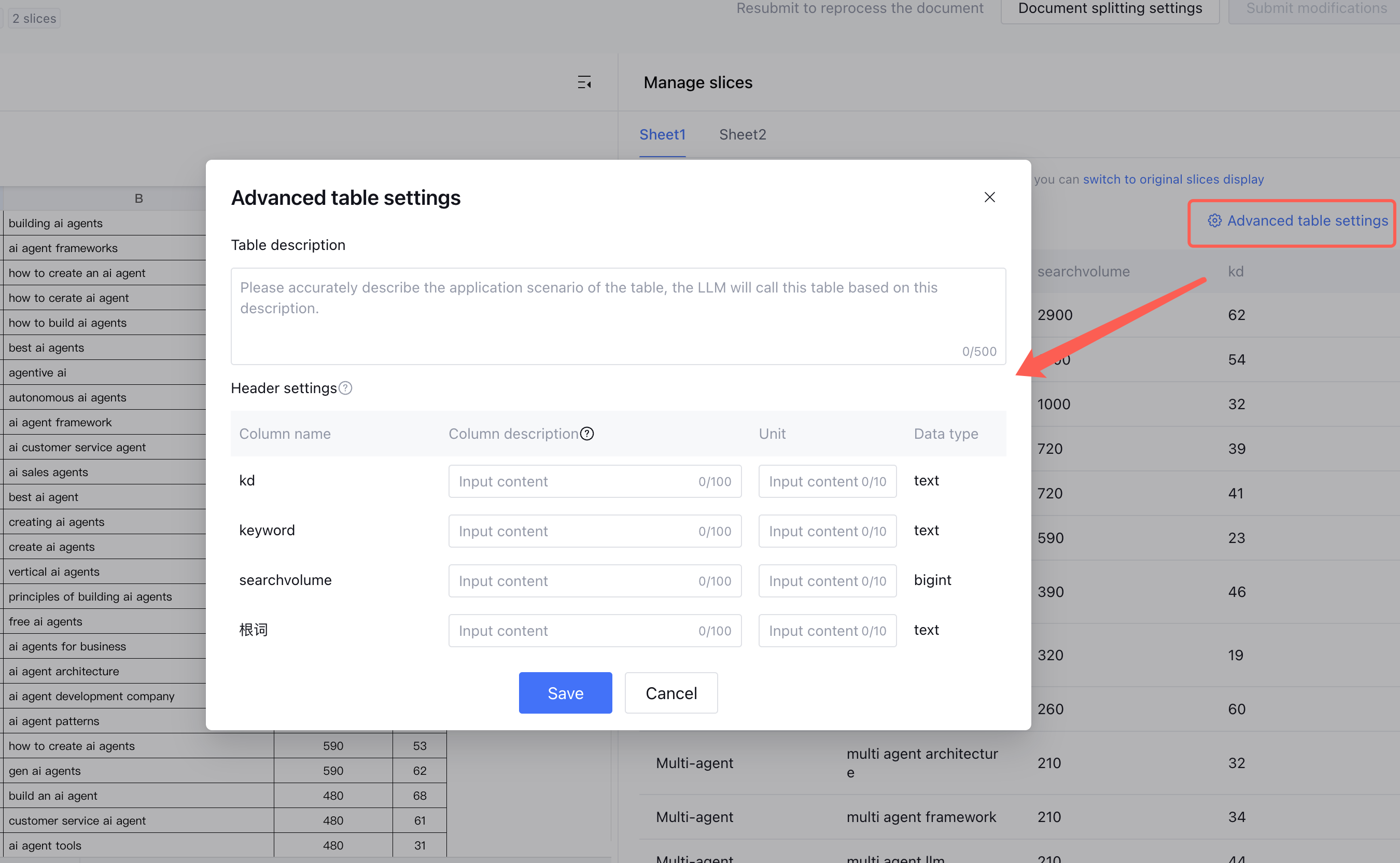 For structured table files, you can click "Advanced table settings" to add description or customize table header definition, enhancing table retrieval and QA accuracy.