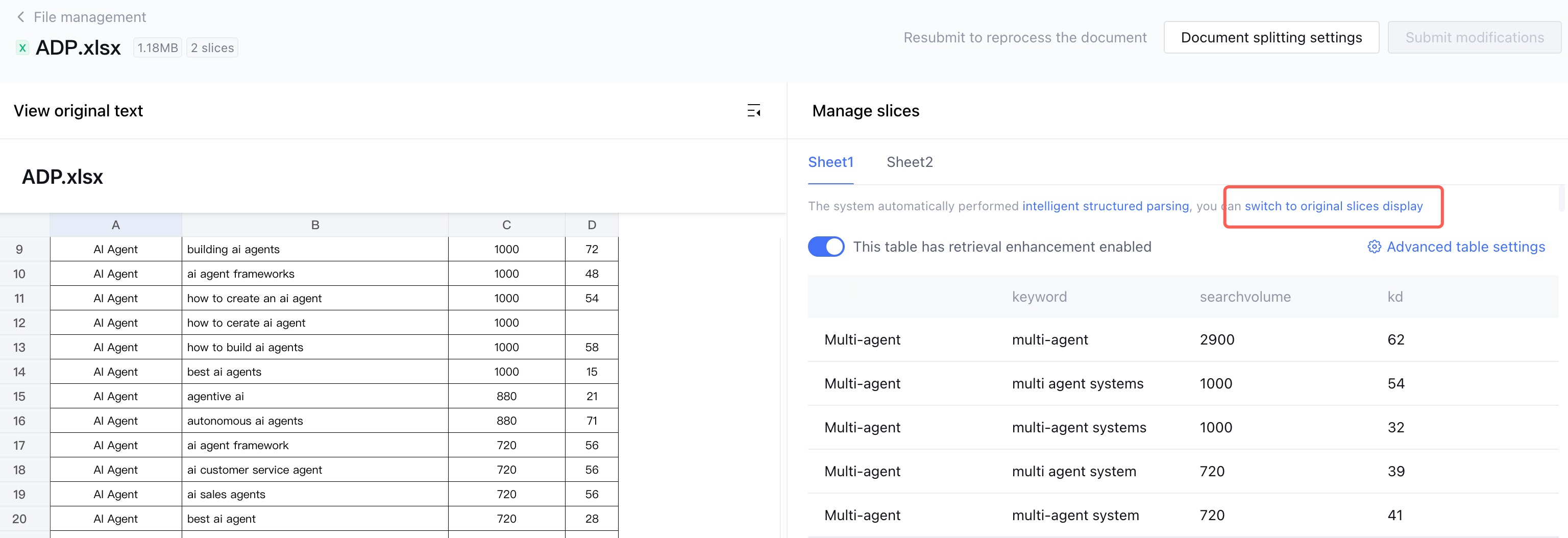If you want to return to edit the markdown result after table parsing and splitting, click switch to original slices display.