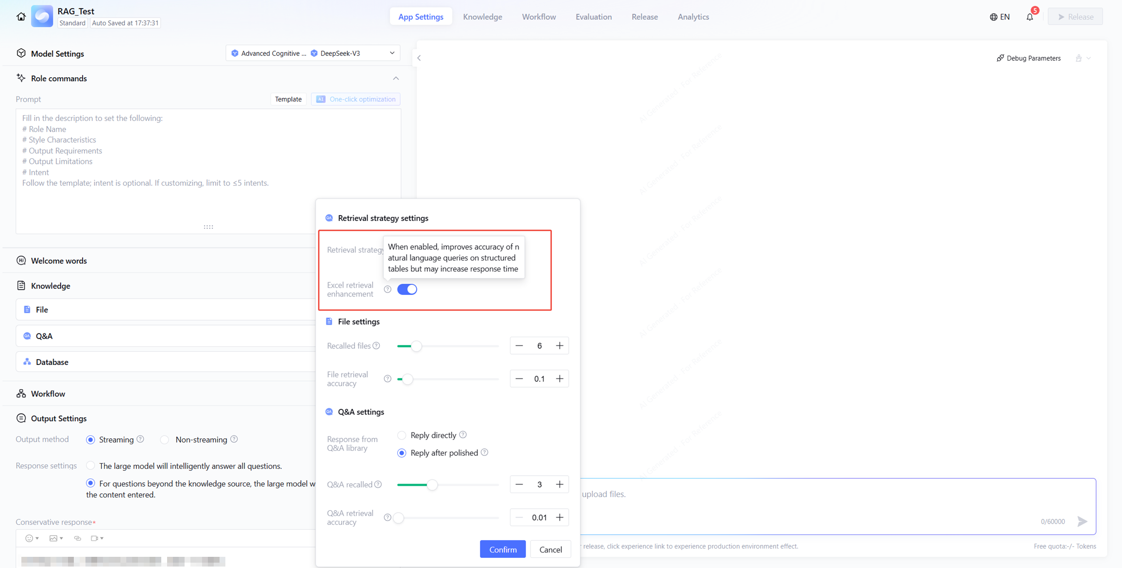 In advanced settings of Application configuration-Knowledge, after enabling the "Excel retrieval enhancement" switch, SQL query for structured tables will be supported to enhance user query and calculation accuracy for such files based on natural language. If the switch is off, "Semantic Retrieval" or "Hybrid Retrieval" policy will be used by default to retrieve semantic slices for spreadsheet QA.