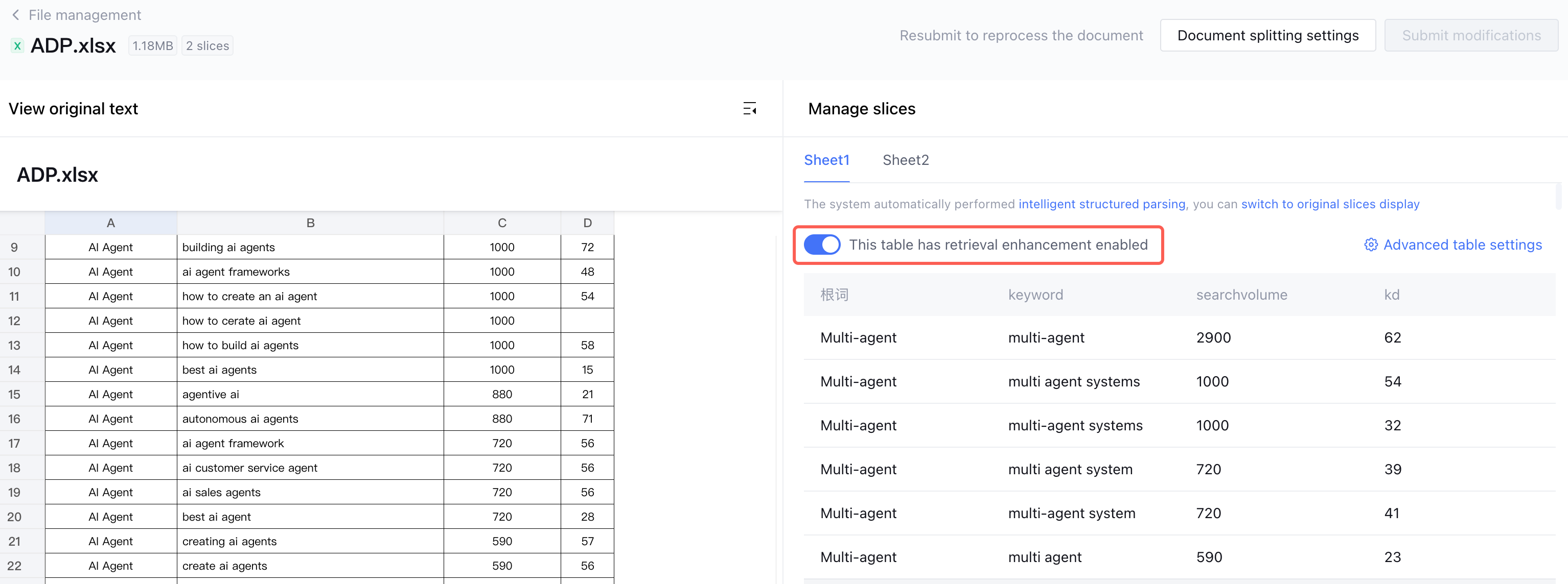 After the user uploads documents, the system automatically determines whether the imported table file is in a structured format by calling the structured table rewrite model. No need to do any additional configuration.