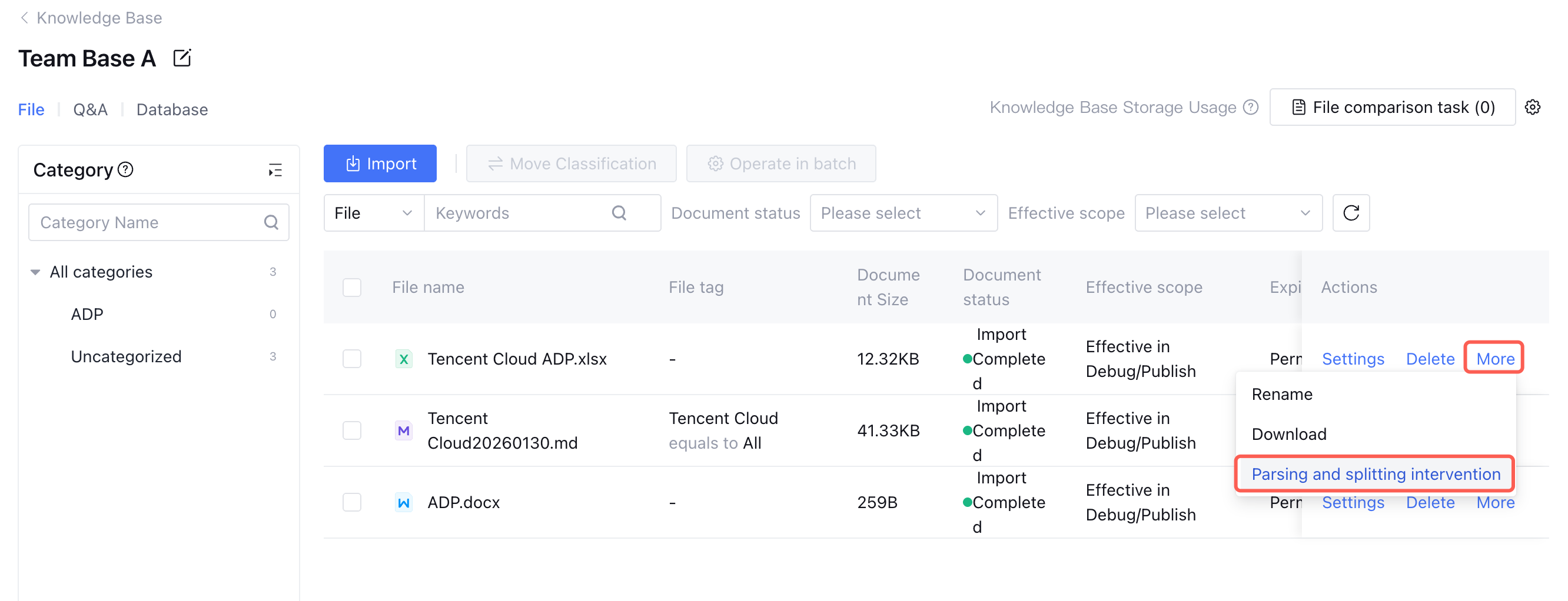 After uploading a structured table file, you can click More > Parsing and splitting intervention on the right side of the corresponding file in the document list. Upon entering the secondary page, view the structured display.