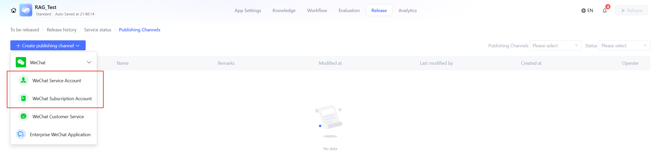 1. Click Create publishing channel > WeChat, select WeChat Service Account or WeChat Subscription Account.