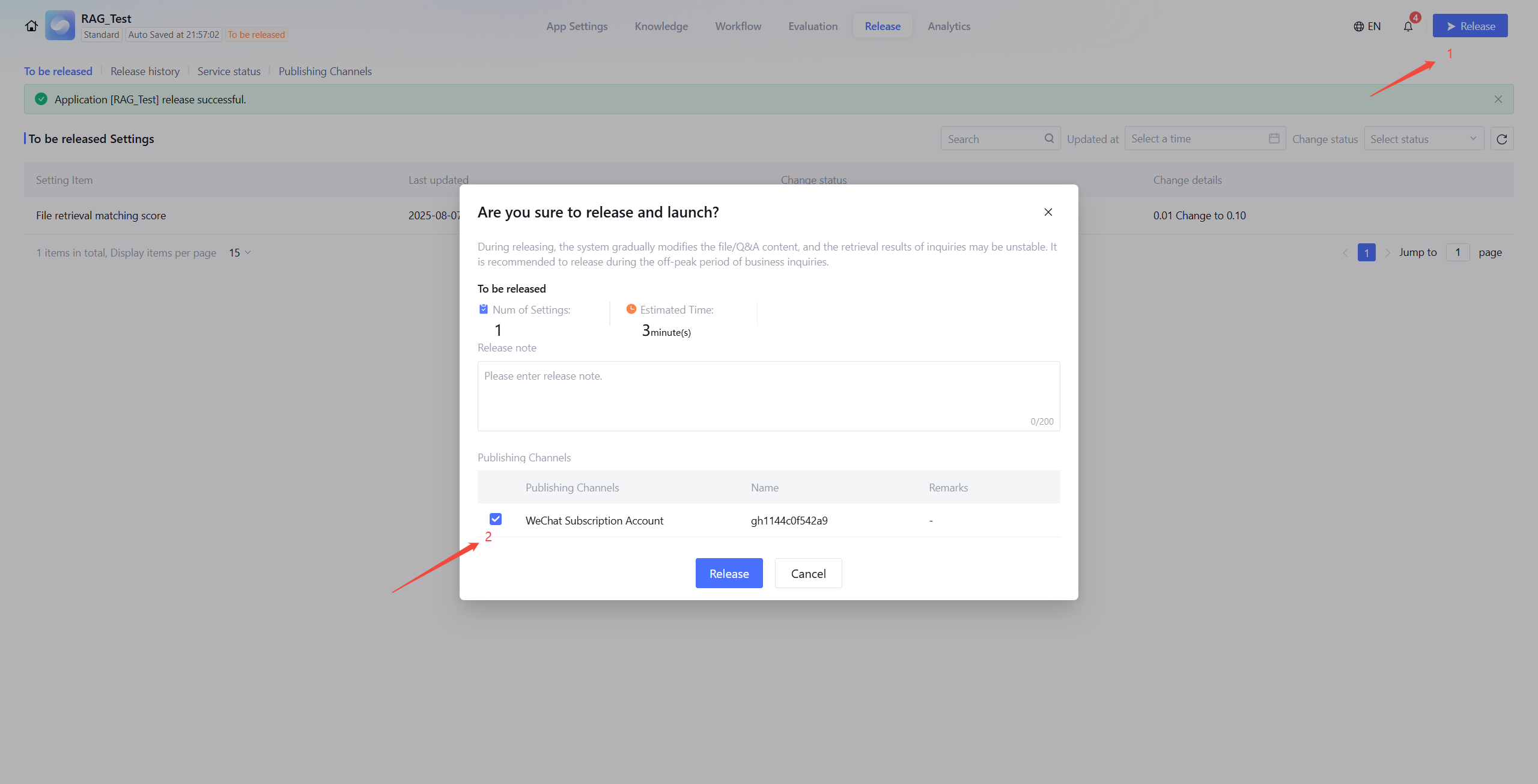 5. Publish the application by selecting the WeChat official account channel. Once successfully published, go to the WeChat official account to start a dialogue with the Intelligent Agent.