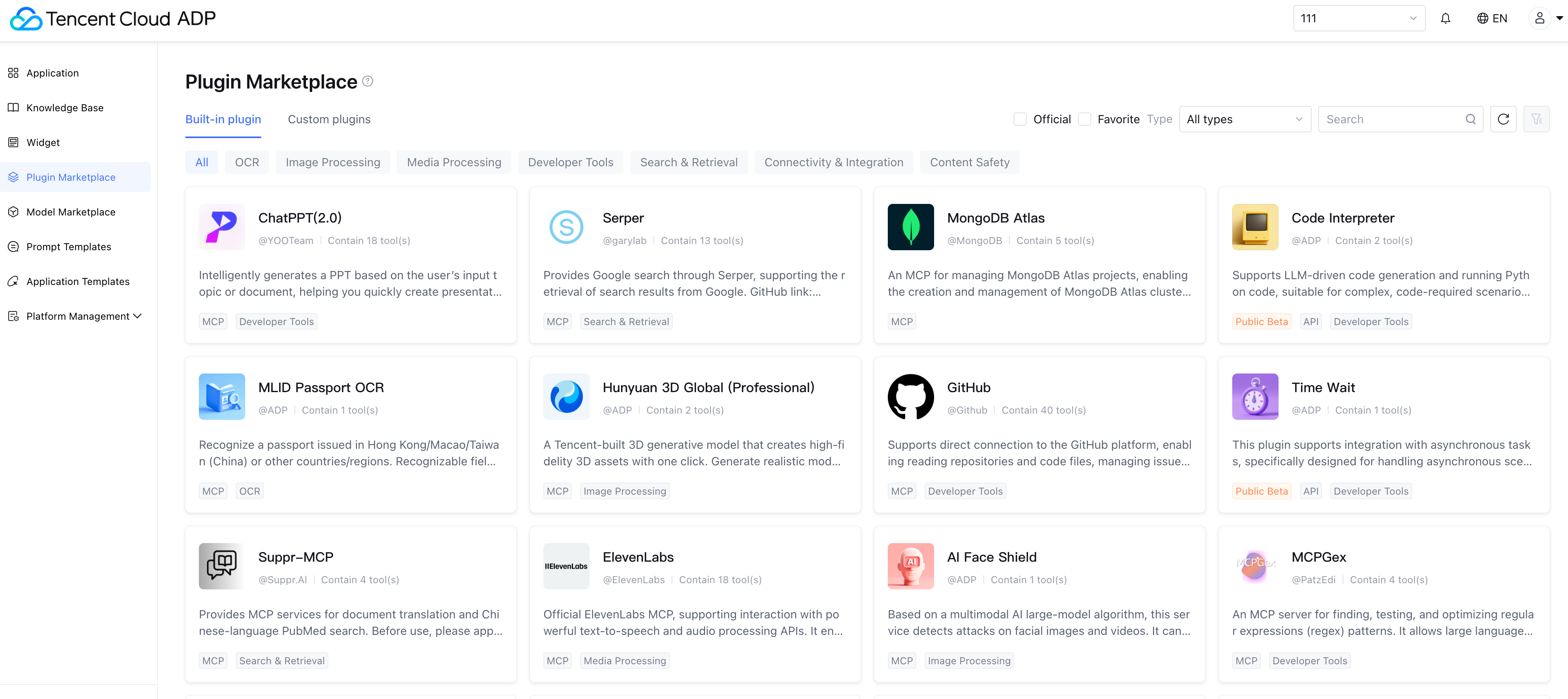 Custom Plugin: If the plugins provided by Tencent Cloud ADP fail to satisfy your utilization need, you can also create custom plugins to integrate the API used or build released applications into reusable plugins. For details, see Create Plugin. Note: