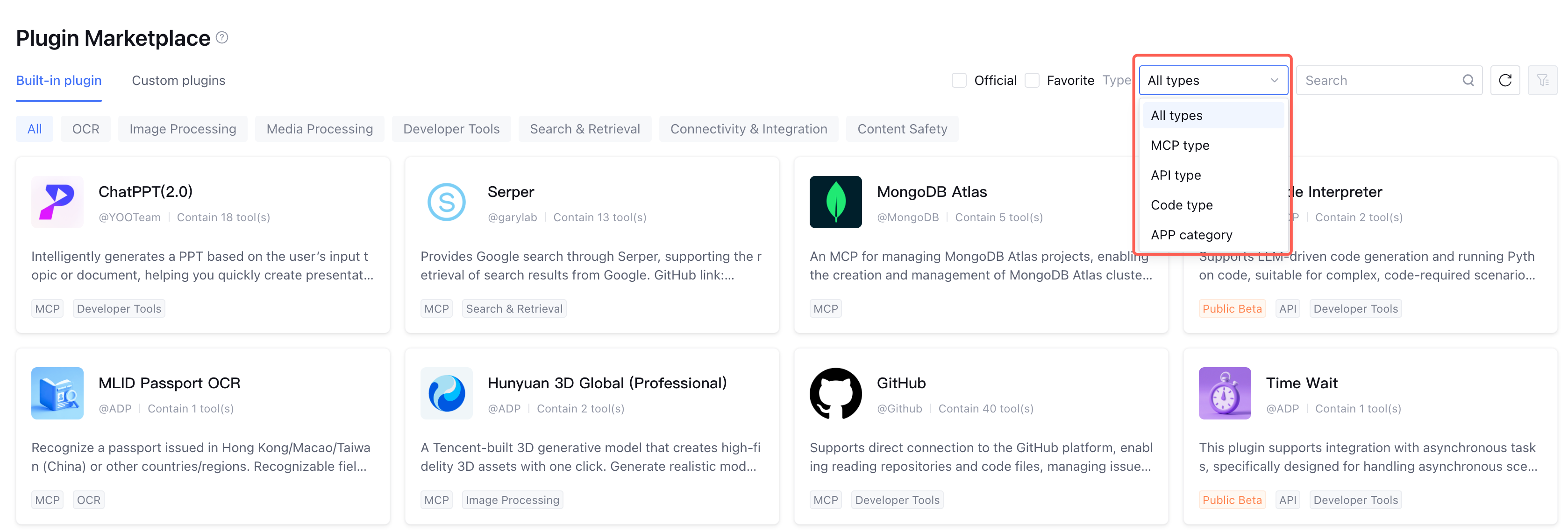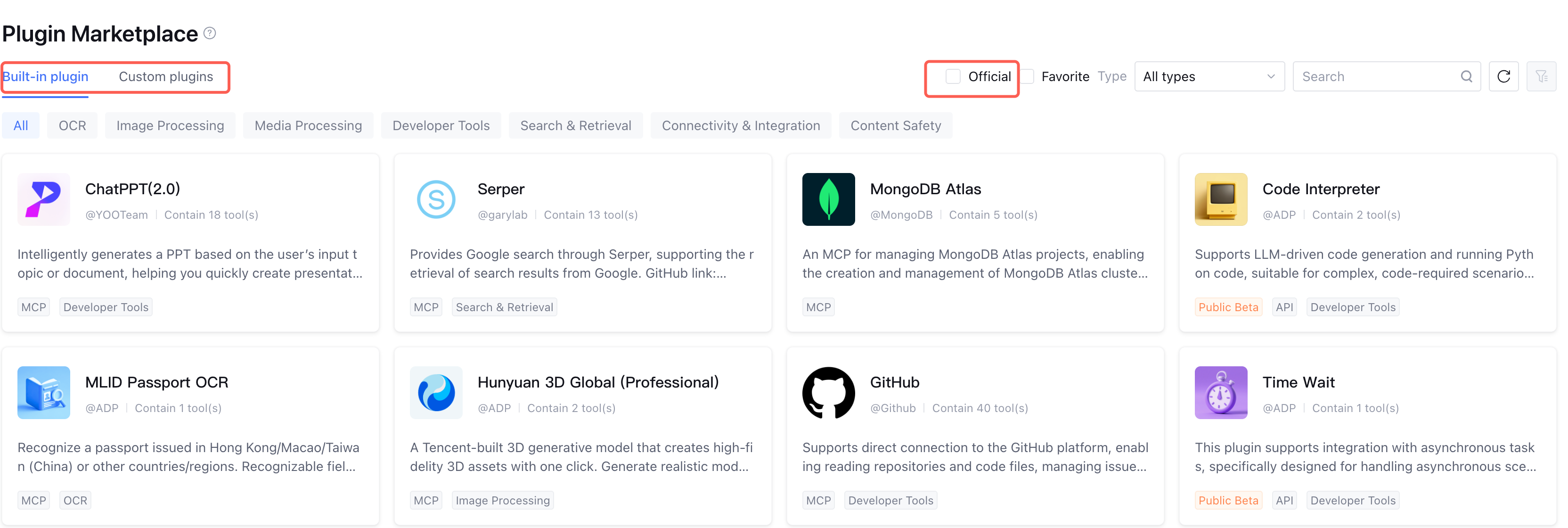 A plugin is a toolset that can contain one or more tools. Plugins are categorized into the following three types: