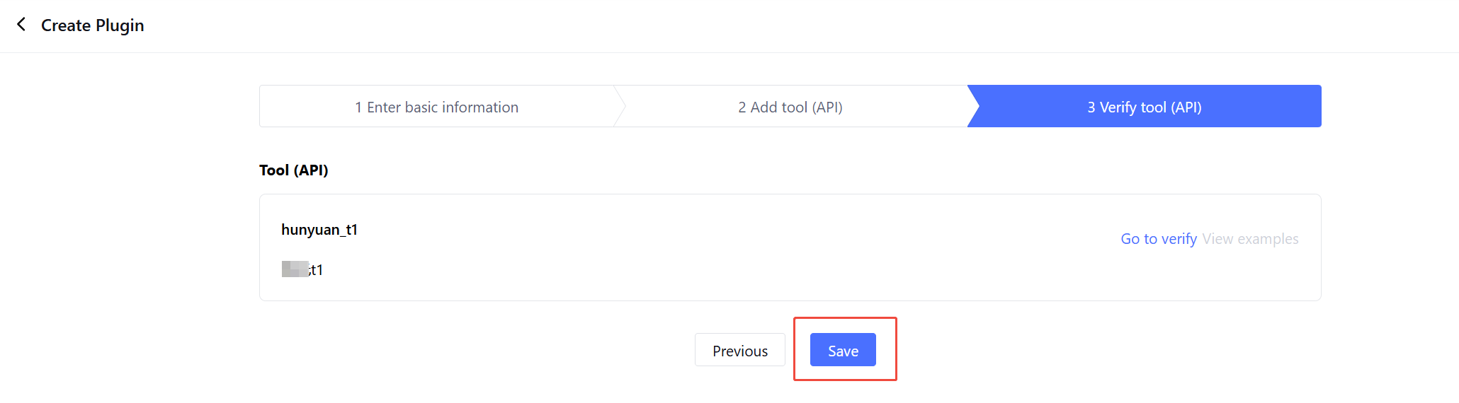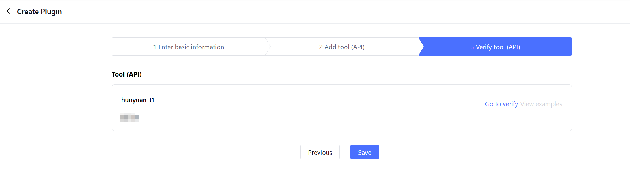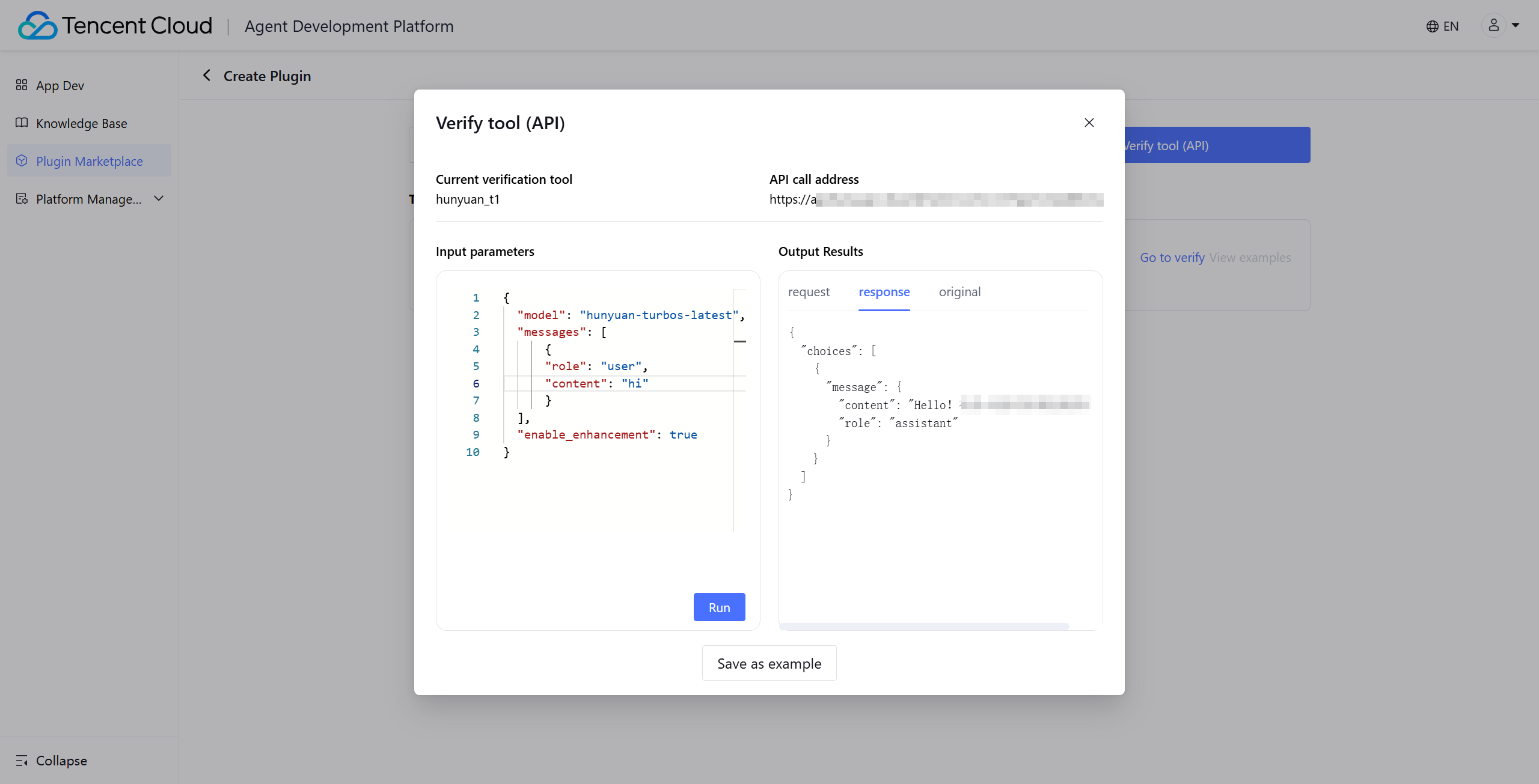 After configuring the tool, proceed to the verification step. In the verification window, fill in the input parameters and perform a trial run to view the call results and test whether the plugin can be called normally. You can save the current test results as an example.