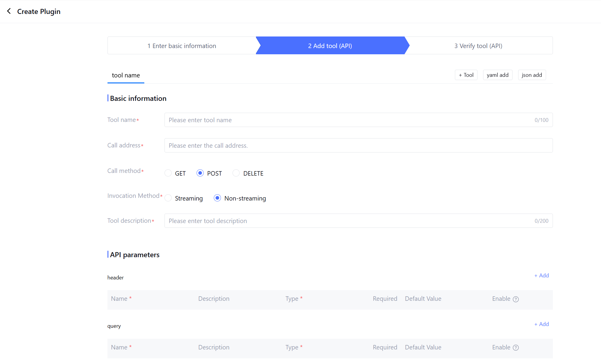 Take manually adding a tool as an example. In the "Add Tool (API)" step, fill in the tool name, call address, etc., configure the corresponding input and output parameters for the API, and complete the configuration. Once completed, click Next.