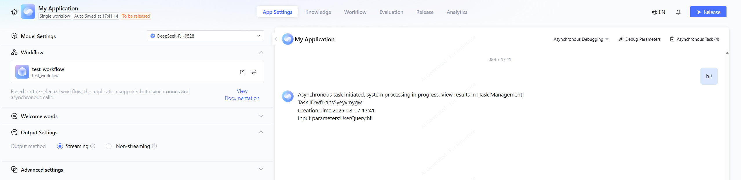 In asynchronous debug mode, the user inputs query in the dialog box to trigger an asynchronous invocation task once. After initiating the call, the page will show the task initiation status, task ID, creation time, input parameters, etc., and prompt the user to view the task execution result in "task result". The task proceeds to execute in the background, so there is no need to wait for the task to complete before proceeding to debug the next task.