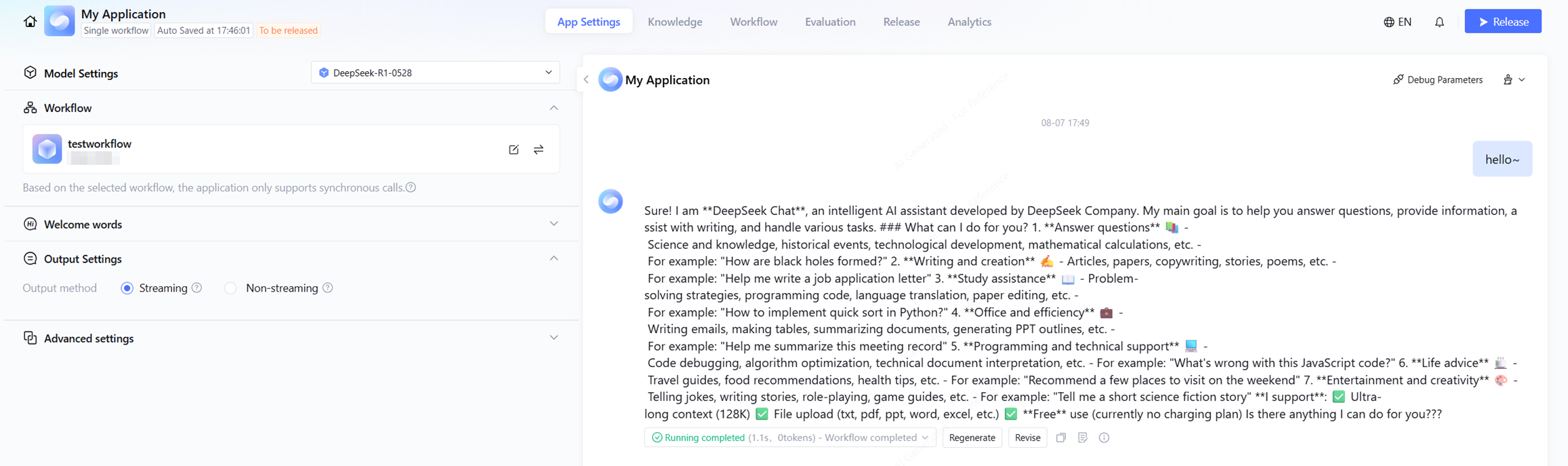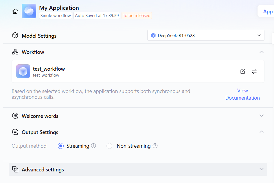 Synchronous call runs the workflow in real time and replies to the user until the flow is completed before the next request can be triggered. For example, when calling the bank customer service workflow to implement credit card installment, the user needs to sequentially complete steps like selecting installment parameters and confirming the fee, then wait for real-time approval results. Only after this complete process can the user initiate a new request. When switching to Single Workflow Mode, it defaults to synchronous call.