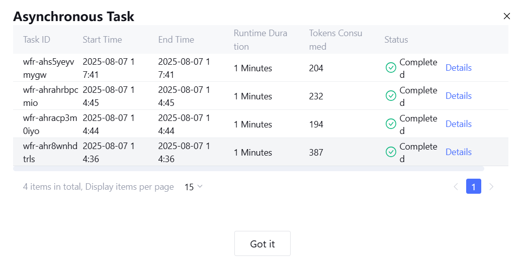 Click "Asynchronous Task" to view the execution status of specific asynchronous tasks.