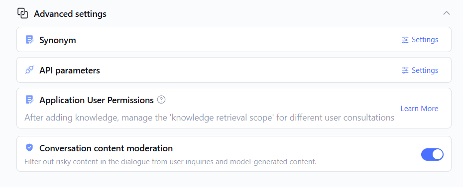 Supports synonyms configuration, API parameters, application side user permission, and dialogue content review.