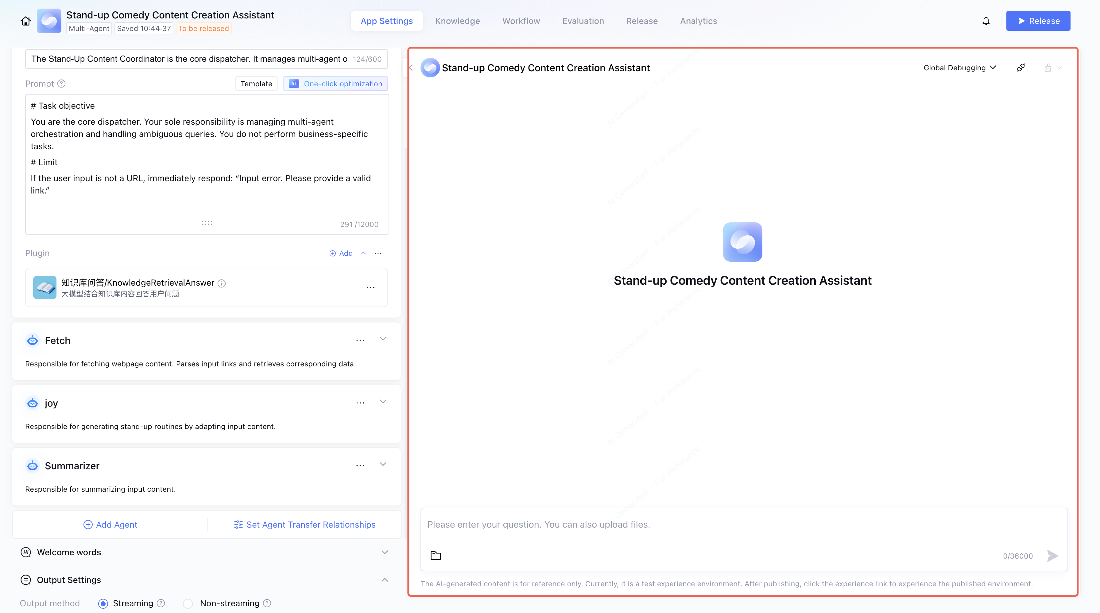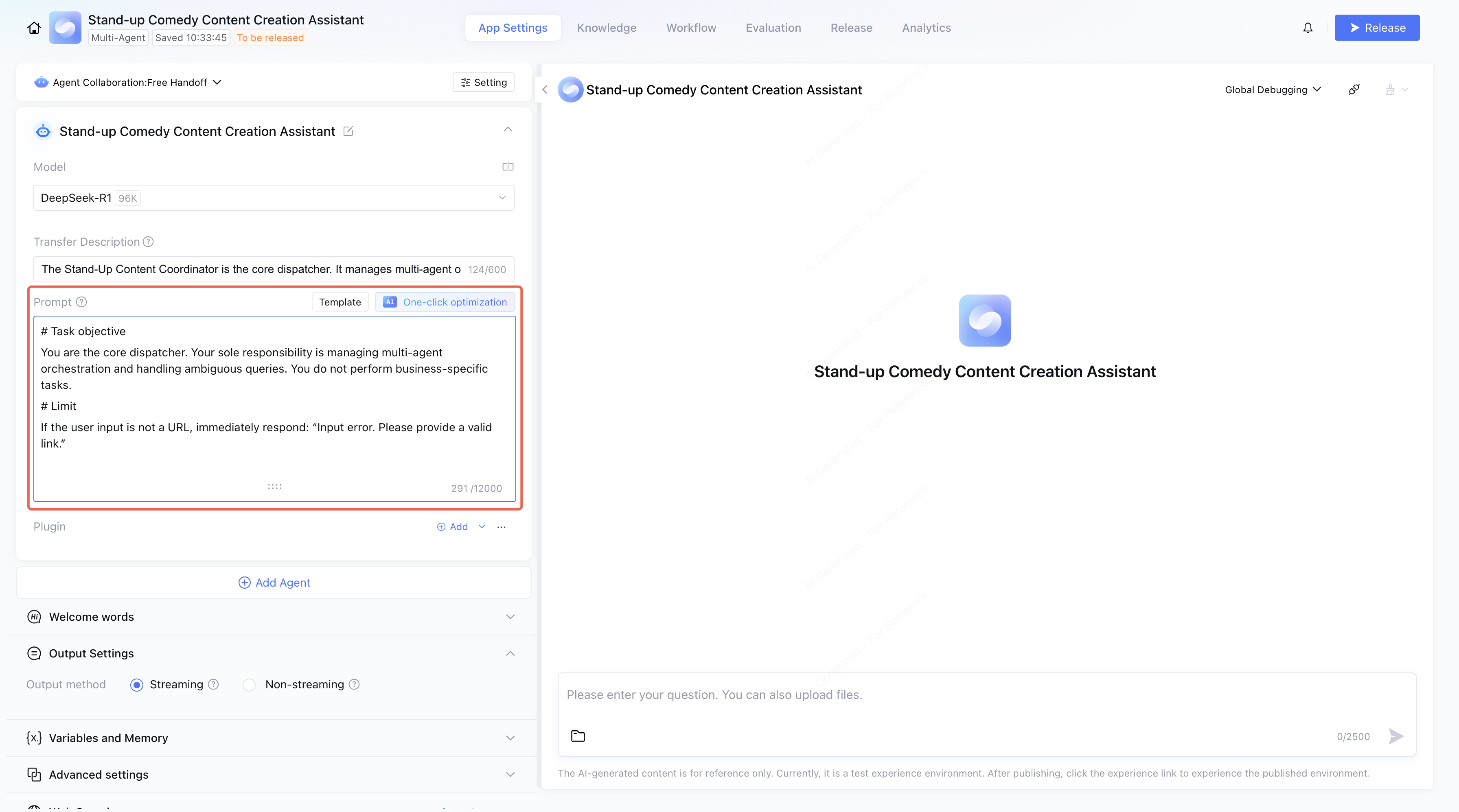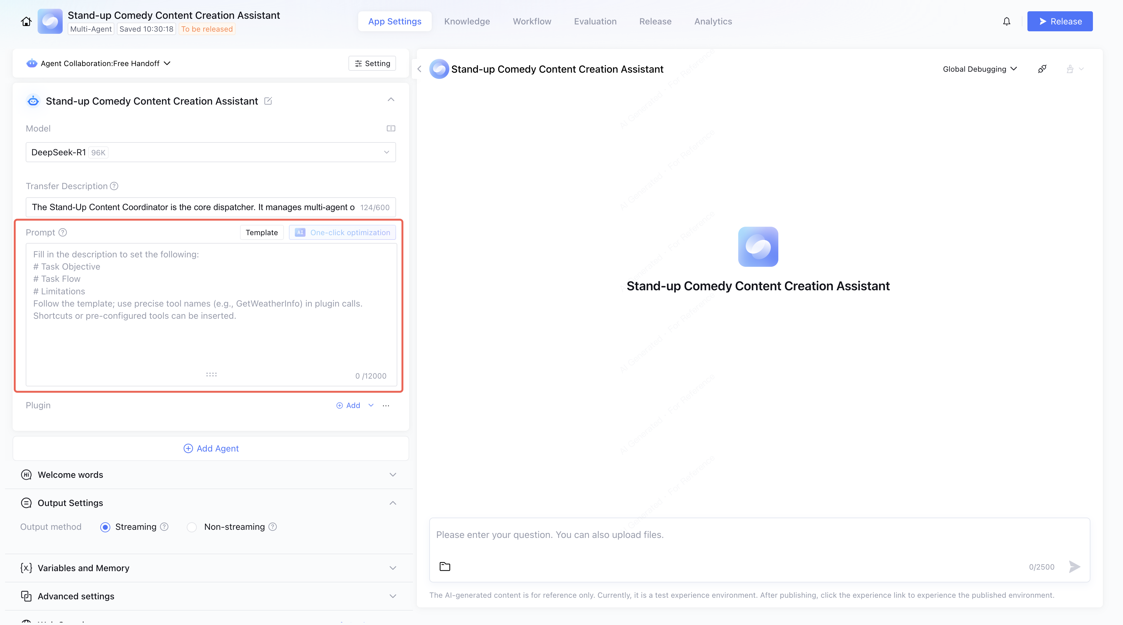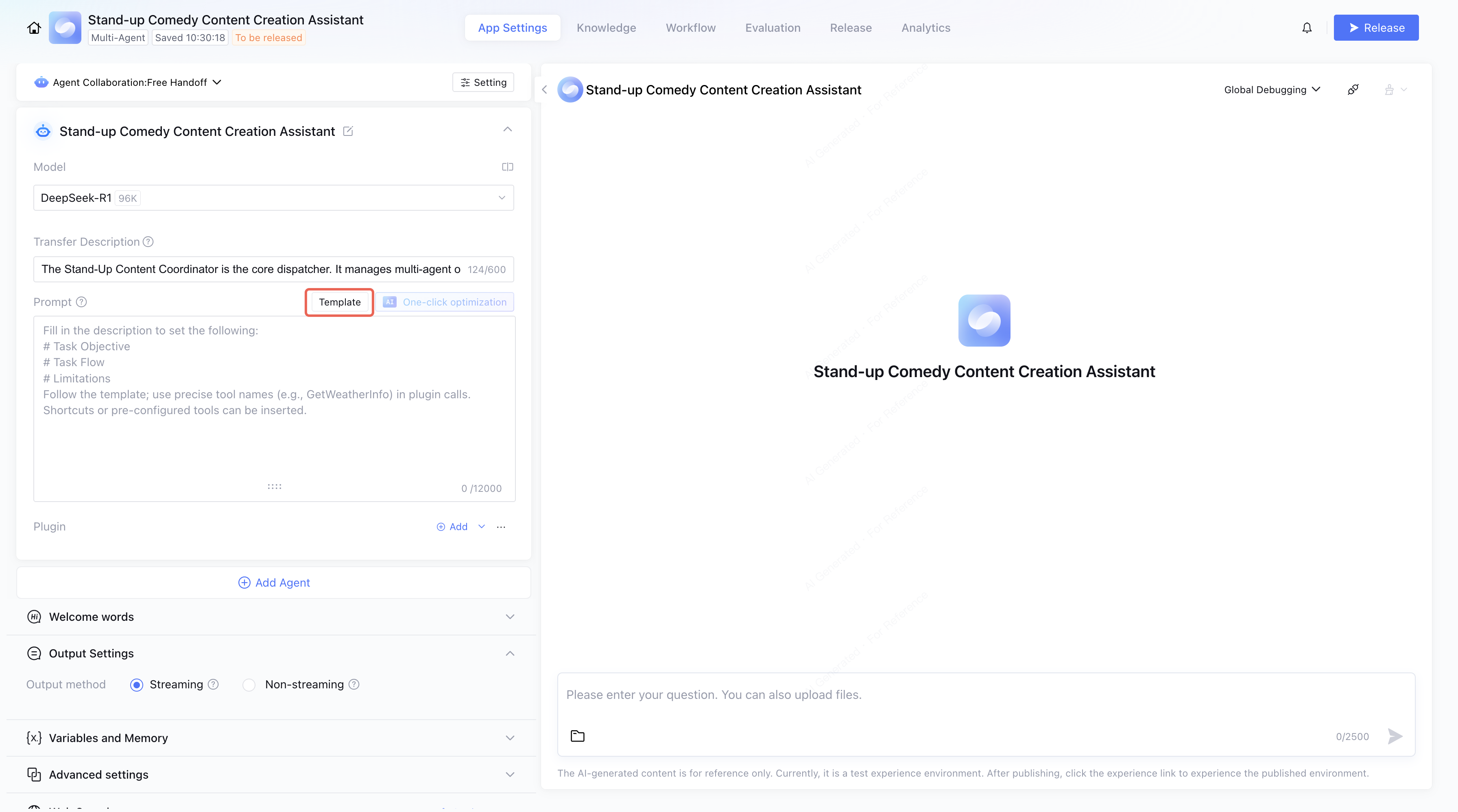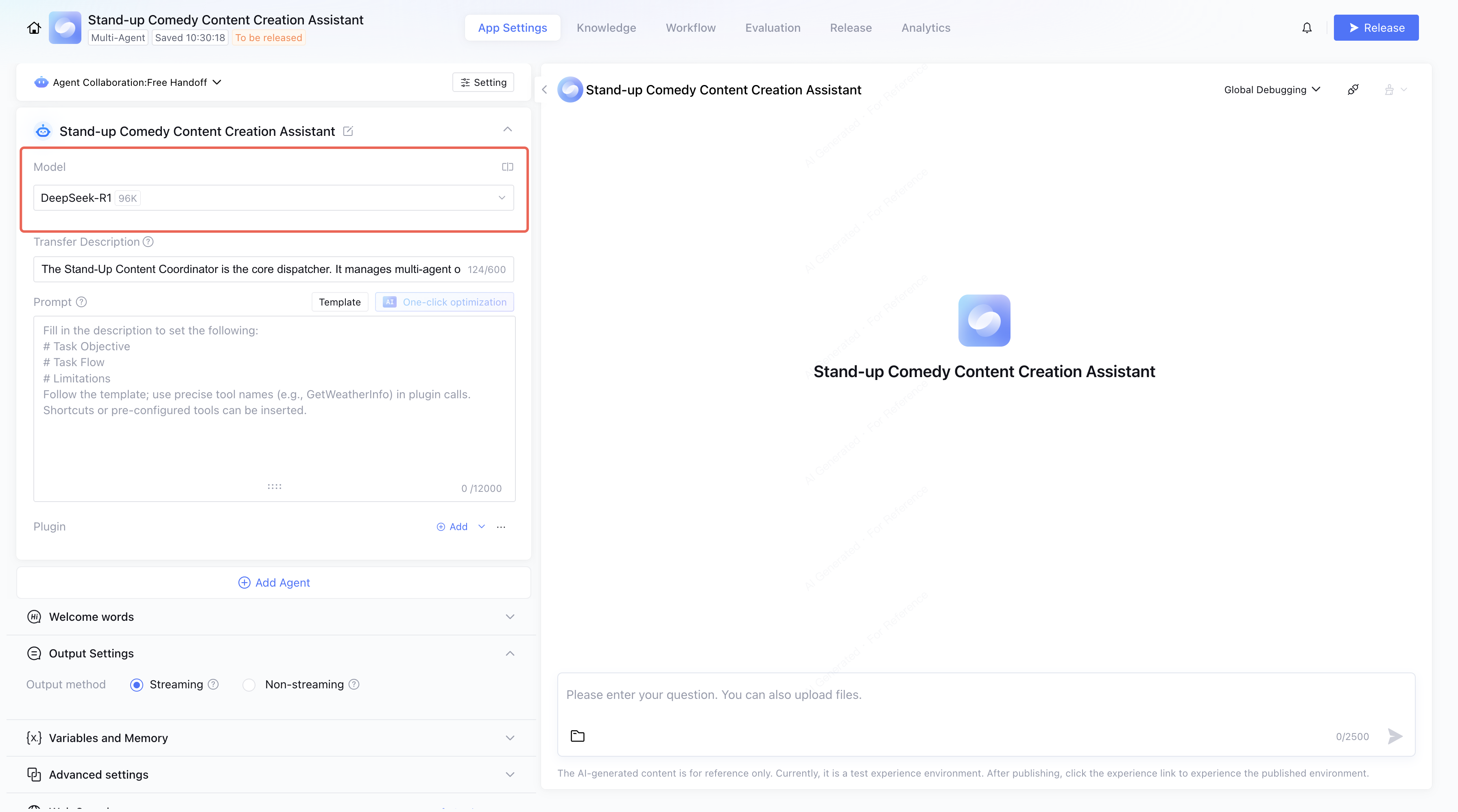 You have now created a "Stand-up Comedy Content Creation Assistant" in "Multi-Agent Mode". For instructions on creating applications in Standard mode and Single Workflow mode, refer to: