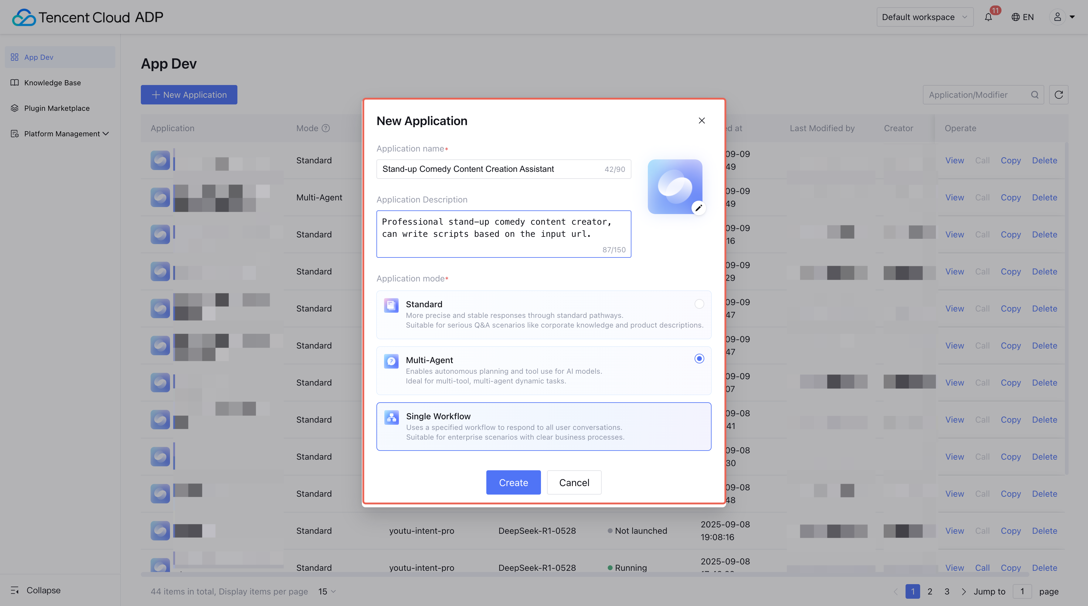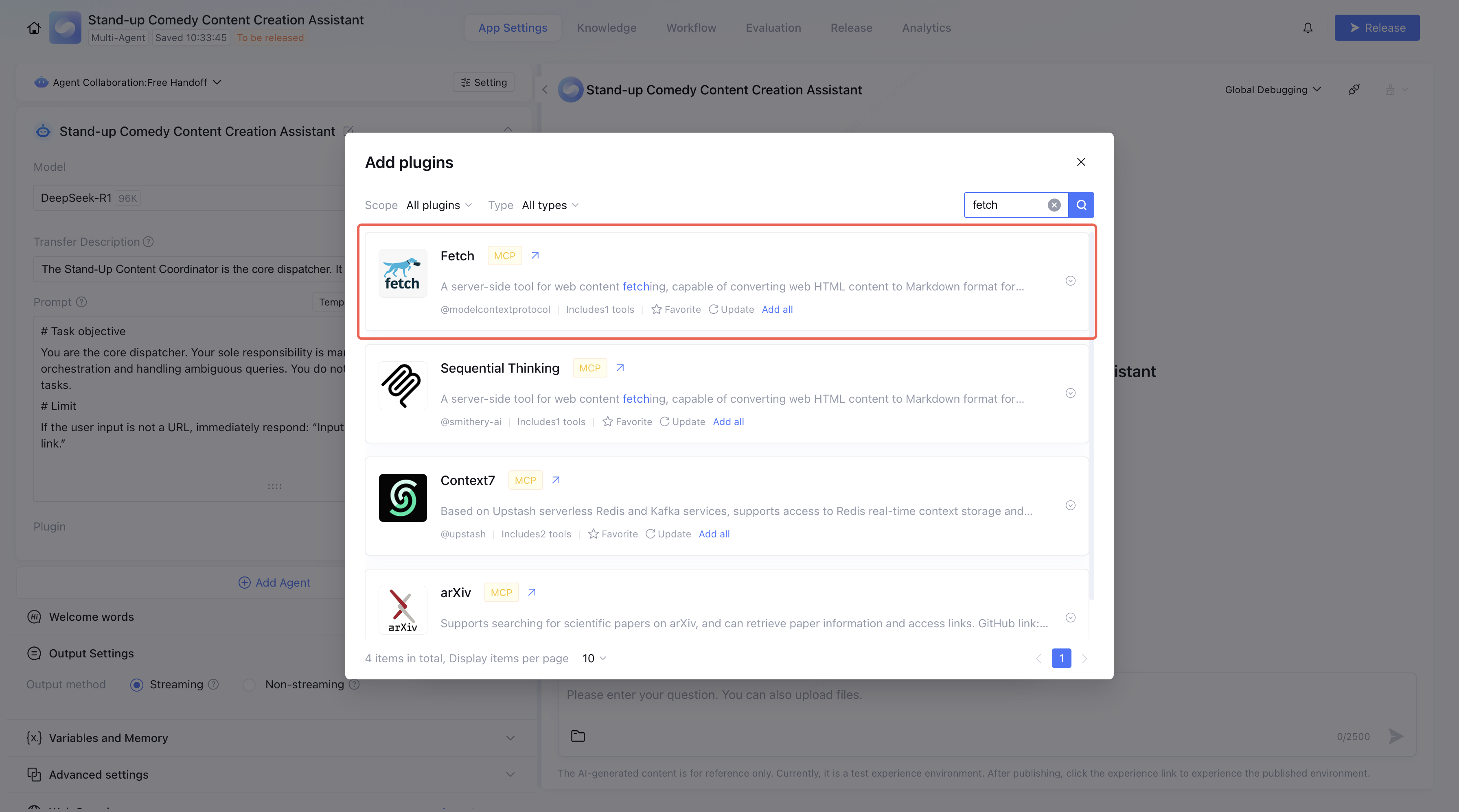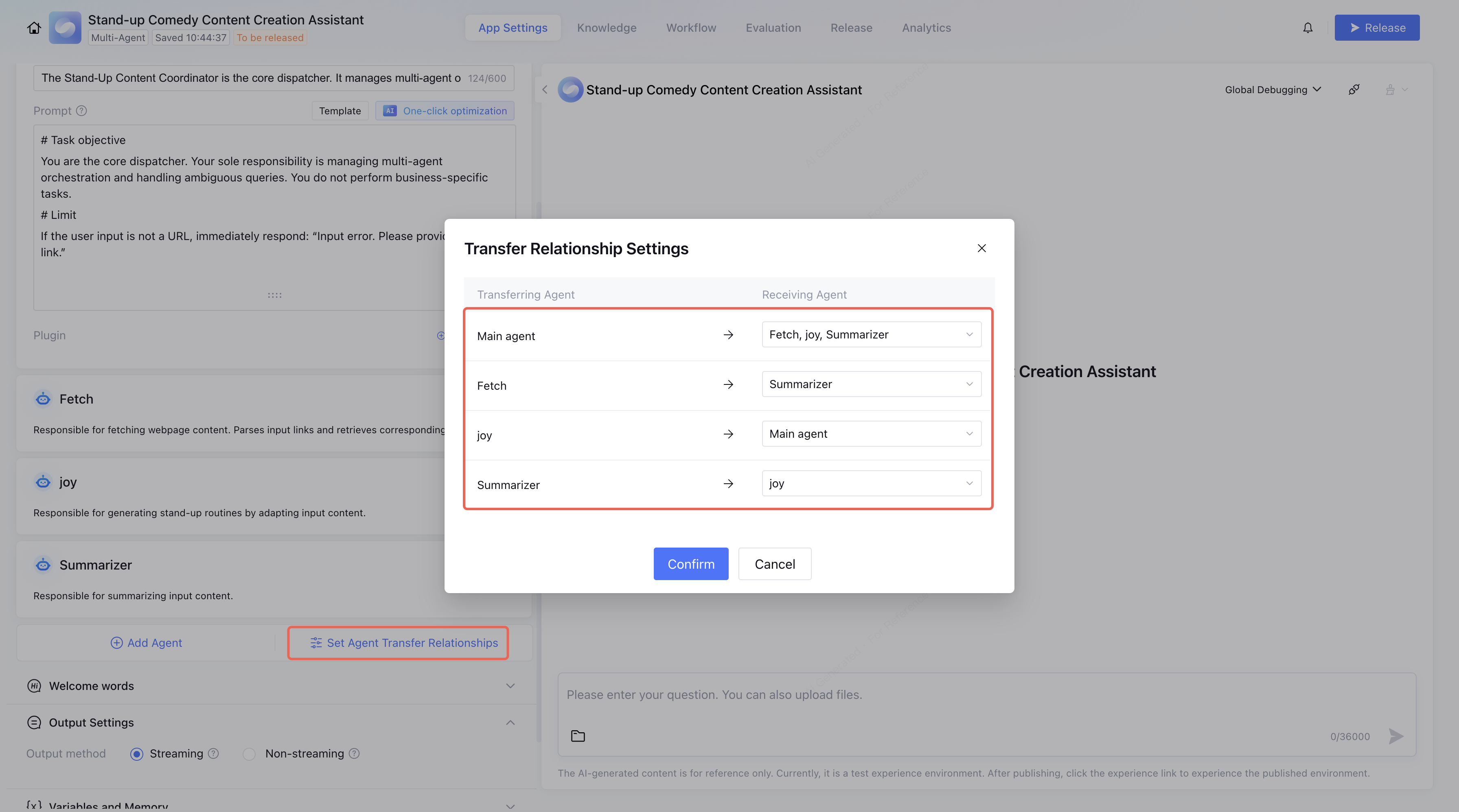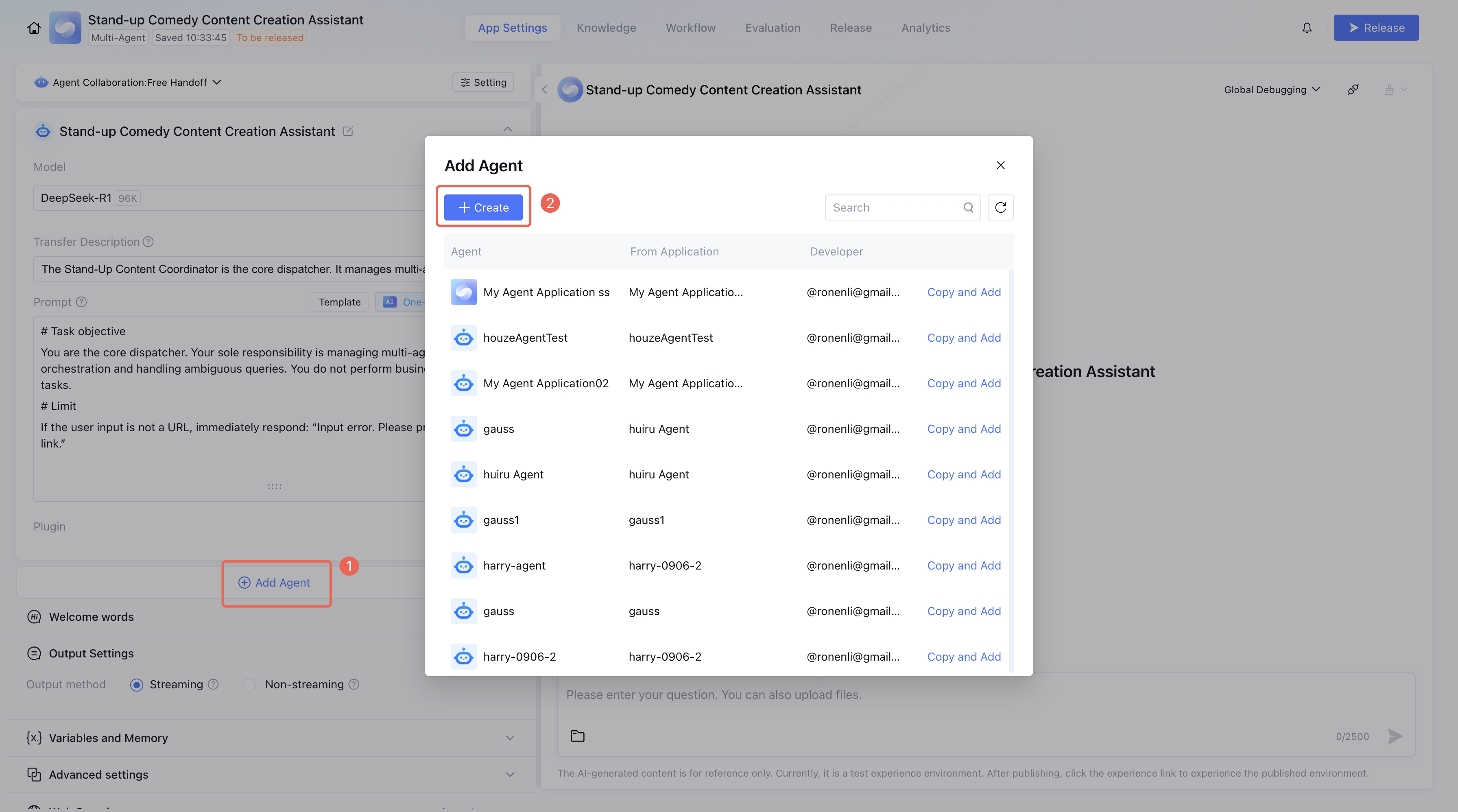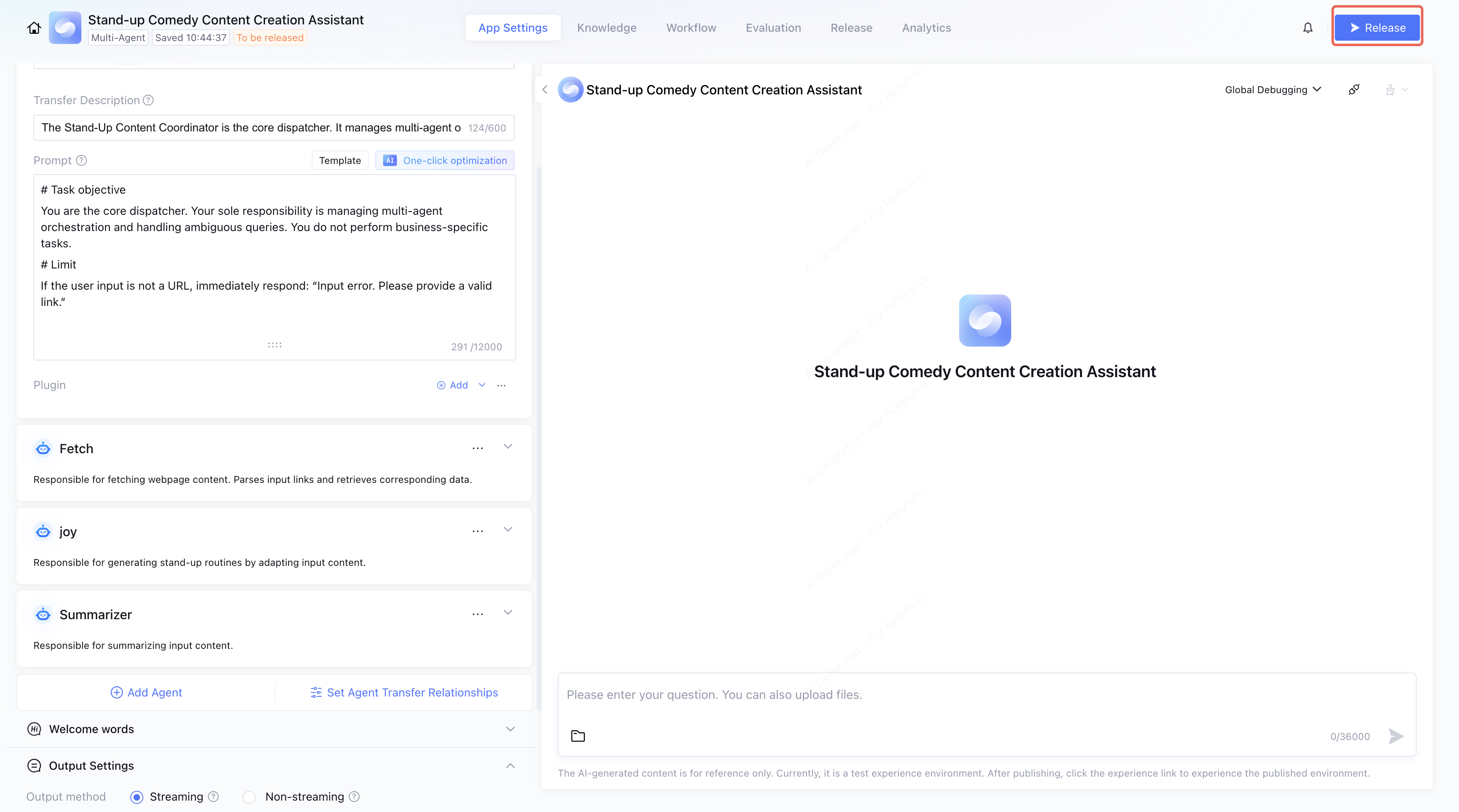 You have now created a "Stand-up Comedy Content Creation Assistant" in "Multi-Agent Mode". For instructions on creating applications in Standard mode and Single Workflow mode, refer to: