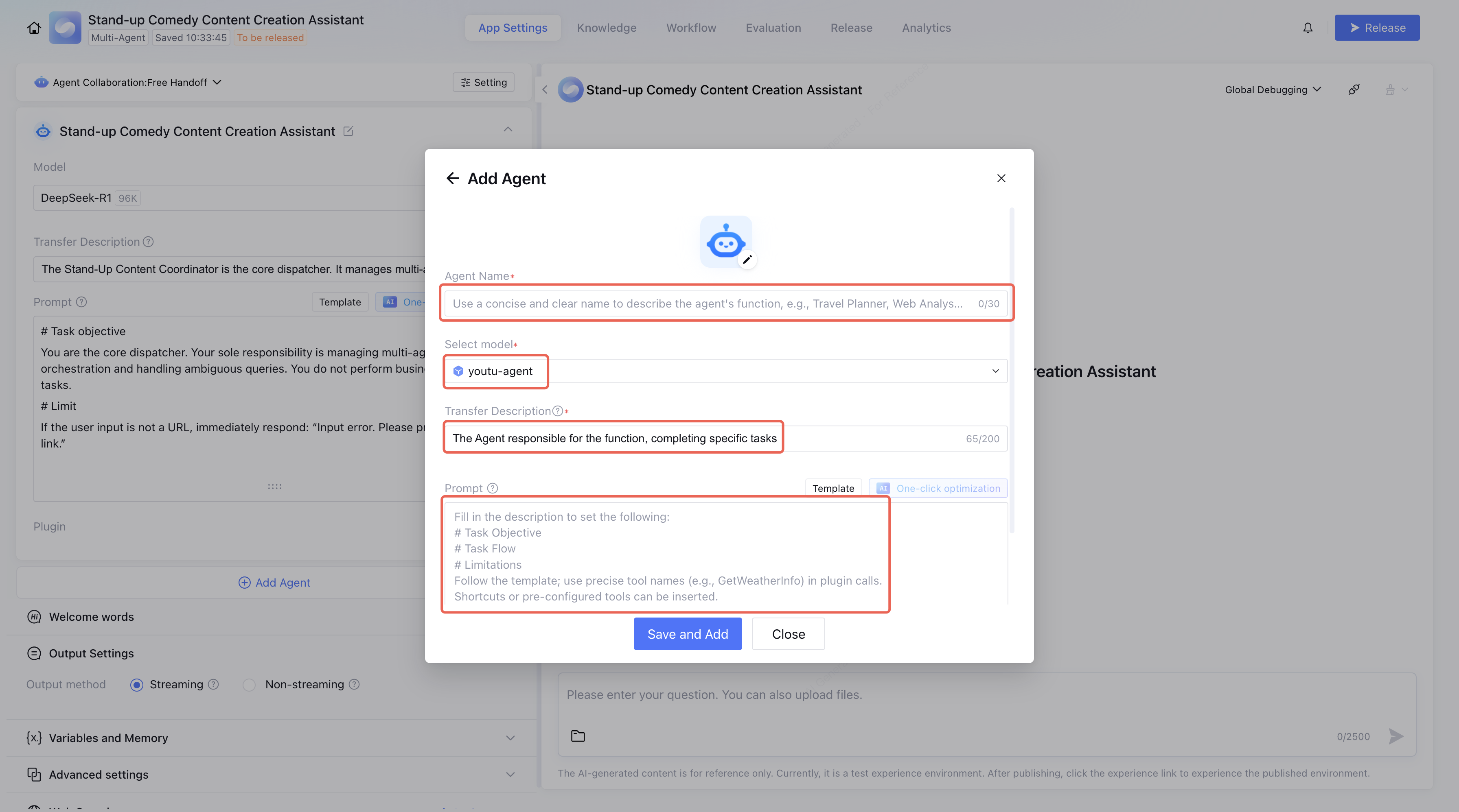 2.2.2.1 Fill in the Agent name, model, transfer description, and prompt.