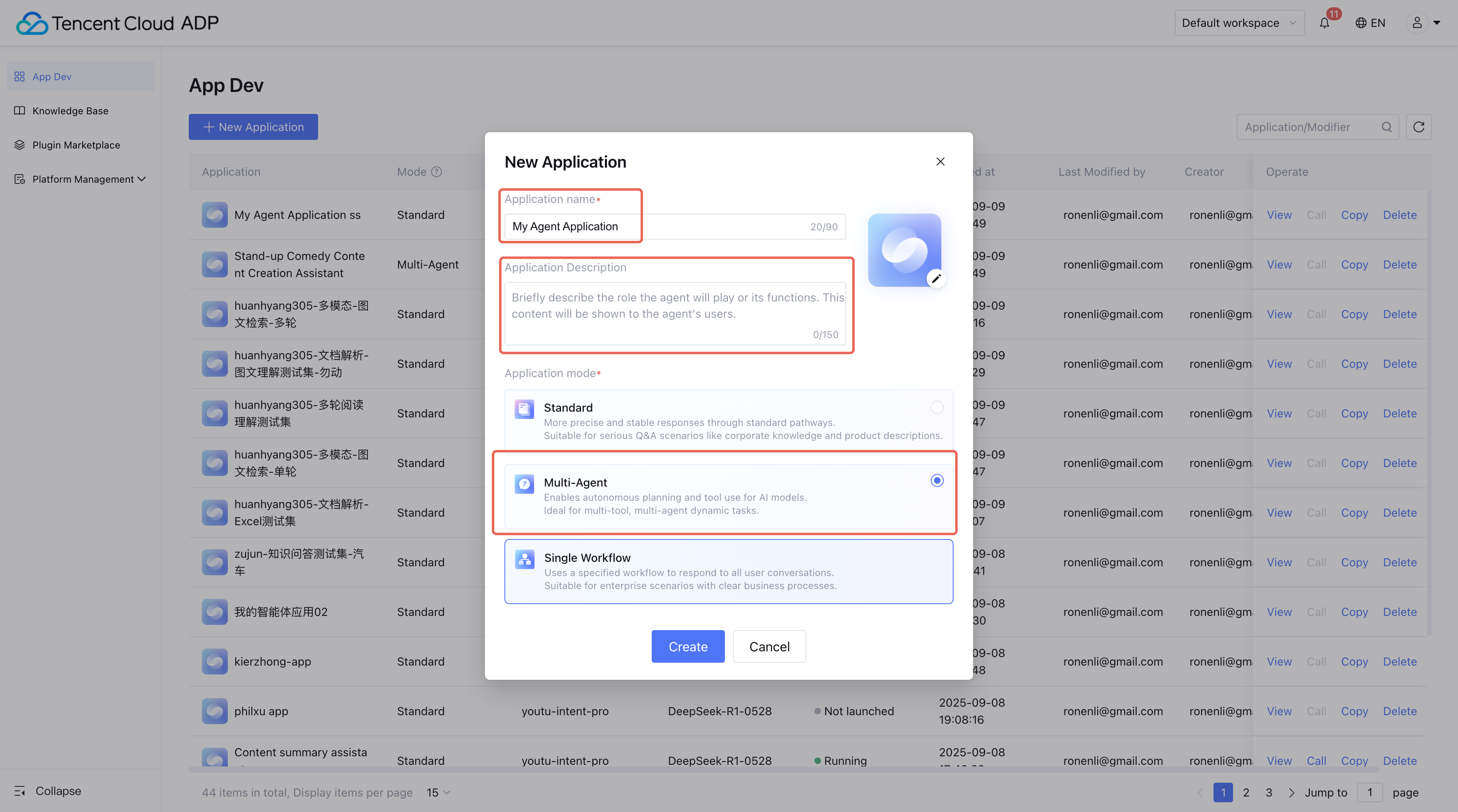 2.2 Click New Application, enter application name and application description, then select Multi-Agent Mode for Application mode.