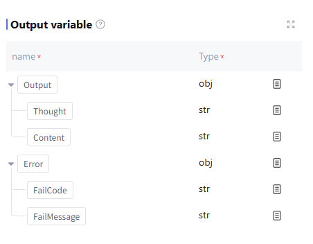 The output variable processed by this node includes the tool invocation process and final result as well as runtime Error info (data type: object, this field is empty during normal operation). Manual addition is not supported.