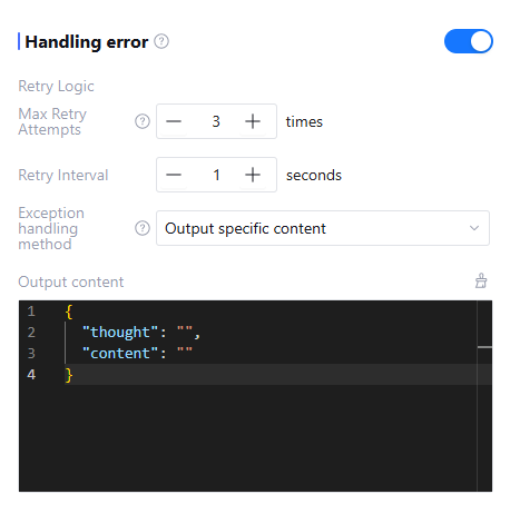 Exception handling can be enabled manually, supporting exception retry and output content configuration for anomalies. The configuration content is as follows: